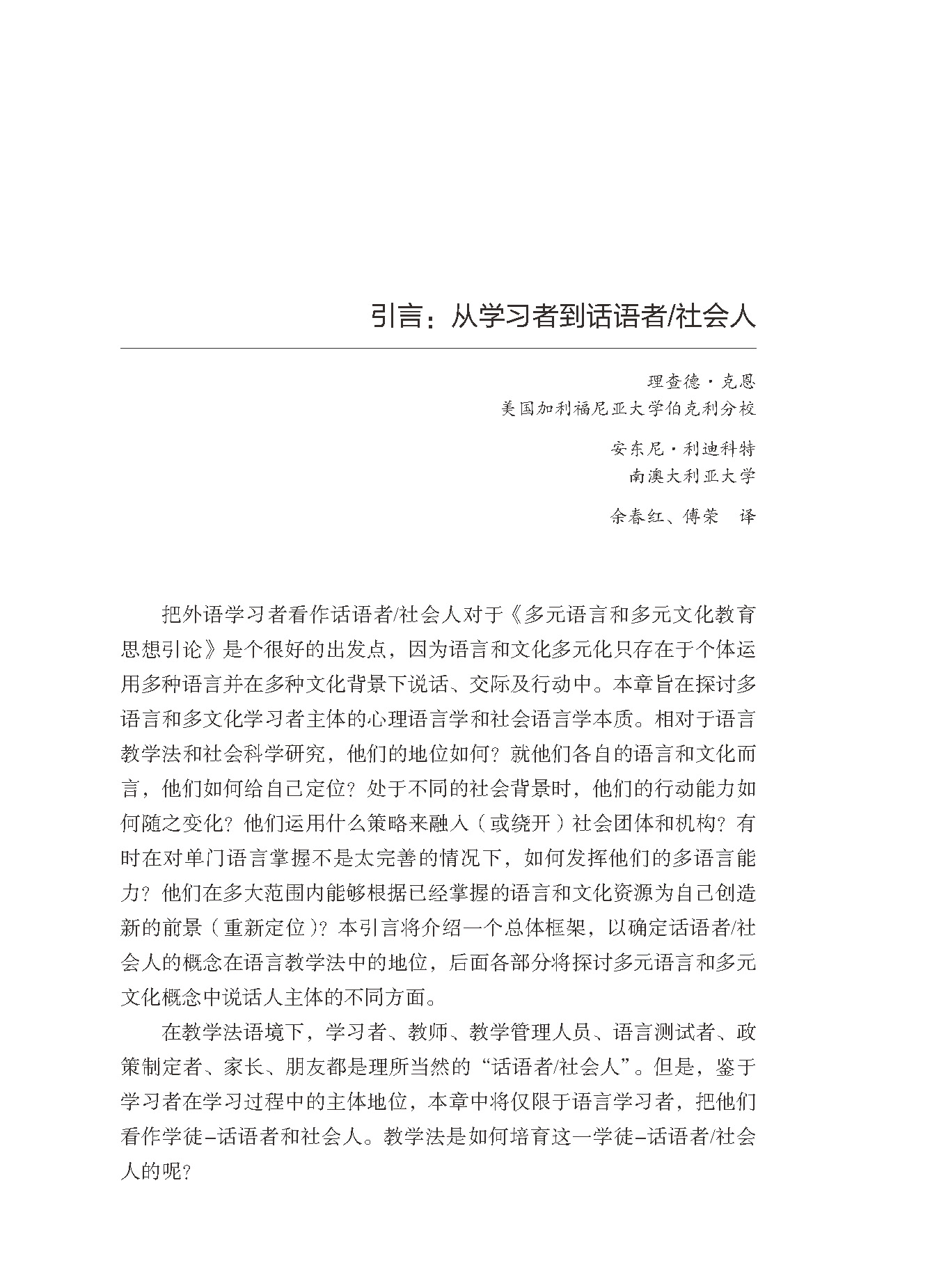 《多元语言和多元文化教育思想引论》是一部围绕同一主题,涉及不同学科的学术作品集。该书大的特点是具有国际性和跨学科性,展示了广阔的学术视野和多维的观察角度,因而信息丰富,观点纷呈,思想活跃,兼具广度和深度。这首先是因为本书的90位作者——来自欧亚非和拉美的68个单位或机构——均是不同领域中多元语言和多元文化教育问题的专家与学者,他们的学科背景涉猎哲学、社会学、政治学、语言学、认知科学、人类学、文学、心理学、历史学、地理学和外语教学法。其次是因为此书将21世纪的语言与文化教学置于欧洲一体化和世界全球化的背景下,开展对多元语言和多元文化教育的历史与现实的反思,讨论了近十年来外语教学和教育领域出现的诸多热点议题,如语言文化多元化、多元语言和多元文化能力、学习者与社会人、人员流动性、语言与身份认同、话语及其社会和文化表征、语言政策、学习策略,等等。此书"将教学实践、现场观察和理论分析融为一体",结论开放,激发人们思考。承担本书翻译工作的北京外国语大学法语系教师和博士研究生,著名语言与文化教学法研究学者傅荣教授对全书译文进行统稿和审校。