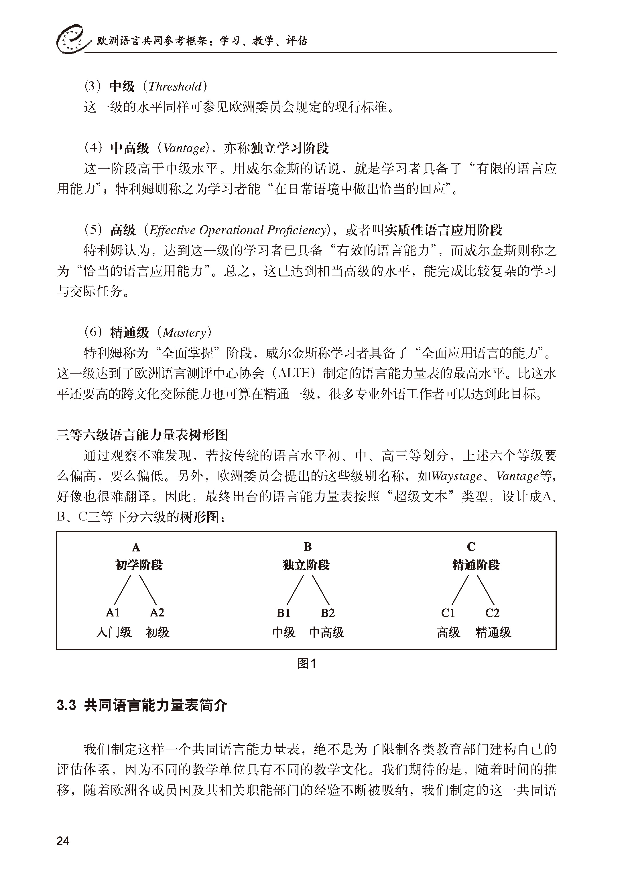 他山之石,可以攻玉。我们在中国国家汉办的指导和支持下,邀请美国亚利桑那大学英语系主任、孔子学院院长刘骏教授以及北京外国语大学法语系主任傅荣教授组织从事语言教育的专家分别从英文本和法文本对《欧洲语言共同参考框架:学习、教学、评估》进行对比翻译并由二位专家对中译稿全文进行了审订。为便于大家学习和研究,译者还编制了《汉法英专业术语对照表》作为《欧洲语言共同参考框架:学习、教学、评估》的附录。希望《欧洲语言共同参考框架:学习、教学、评估》的出版有助于广大从事语言教学和研究的专家更好地了解欧洲语言教学的理念和方法,有助于大家在国际汉语教学实践中学习和借鉴。
