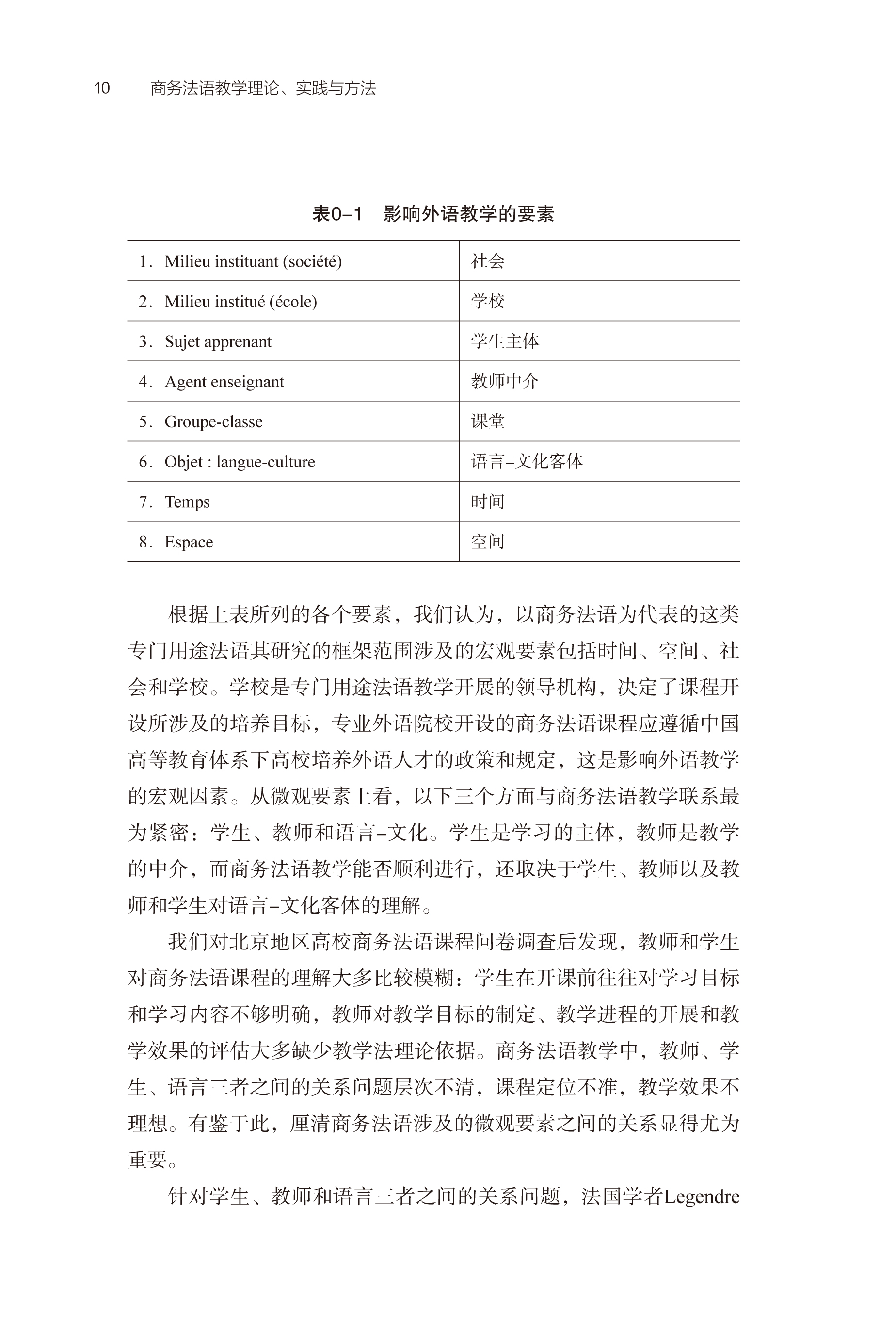 其次,从外语教学涉及的主客体要素(学习者、教师和教材)对商务法语教学实践进行了较为全面的分析,对商务法语的语言特点及商务法语教学课程的设计原则进行了有益的探讨;