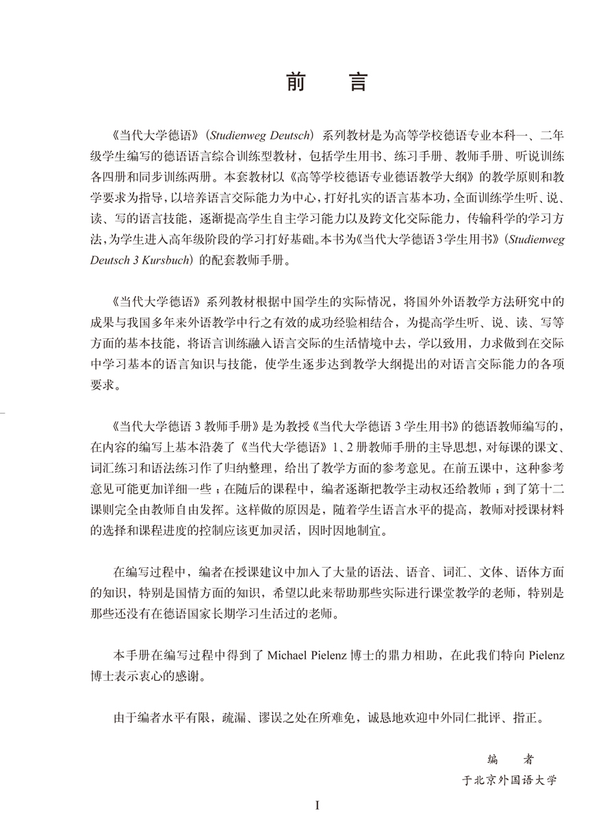《当代大学德语3教师手册》为高等学校德语专业教材《当代大学德语3学生用书》的配套教师手册。本书主要针对的对象是刚刚参加工作的德语教师,在内容的编写上基本沿袭了《当代大学德语1教师手册》的主导思想,为基础教程每一课的教学程序及具体的教学方法提出建议。始终贯彻联系实际、以学生为中心的启发式教学原则,使学生养成主动参与语言实践的习惯。