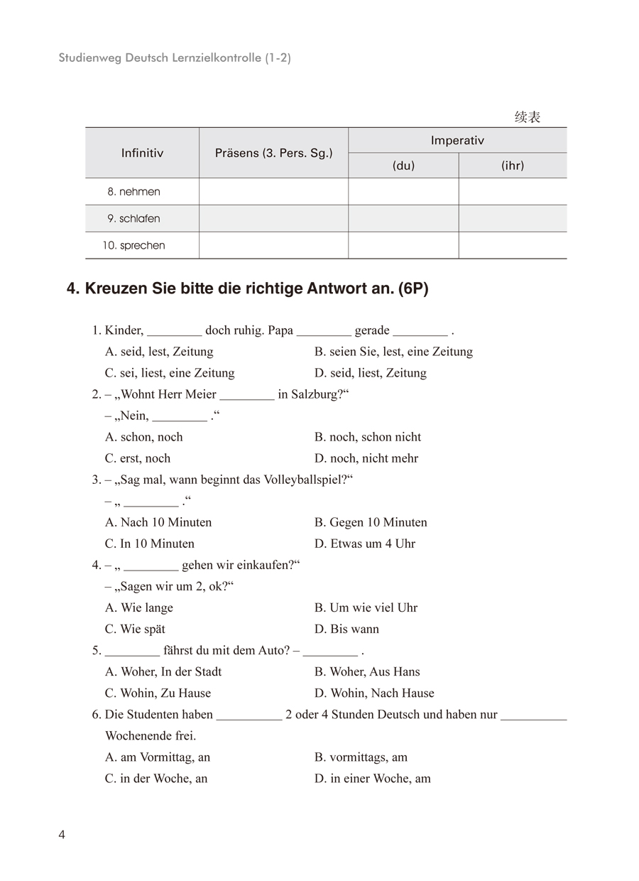 《当代大学德语同步训练(1-2)》作为《当代大学德语(学生用书)》1-2册的配套测试手册,为每三课配一套"阶段测试题"。每套测试题都分语法、词汇、构词法等语言知识以及交际情景、篇章题材等语用层面的练习,并且将听、说、读、写四项基本能力的训练也有机地结合在一起。内文结构顺序主要为:I. 听写——II. 语法词汇——III. 翻译——IV. 阅读——V.写作。其中语法词汇部分紧扣该单元的三课内容。另外,在每套测试题后增加了新的教学设计——Nacharbeit(后续工作),包括"Diktat wiederholen"(复习听写)、"Aufsatzmusterlernen"(学习范文)、"Fehlerstatistik"(统计错误)。本书旨在养并提高学生的学习自主性,以此为学生搭建起一个相应的输出平台,使之能掌握科学的学习方法并积极主动地参加语言实践。本书配有MP3听力资料,描封底二维码即可获取听力文件。
