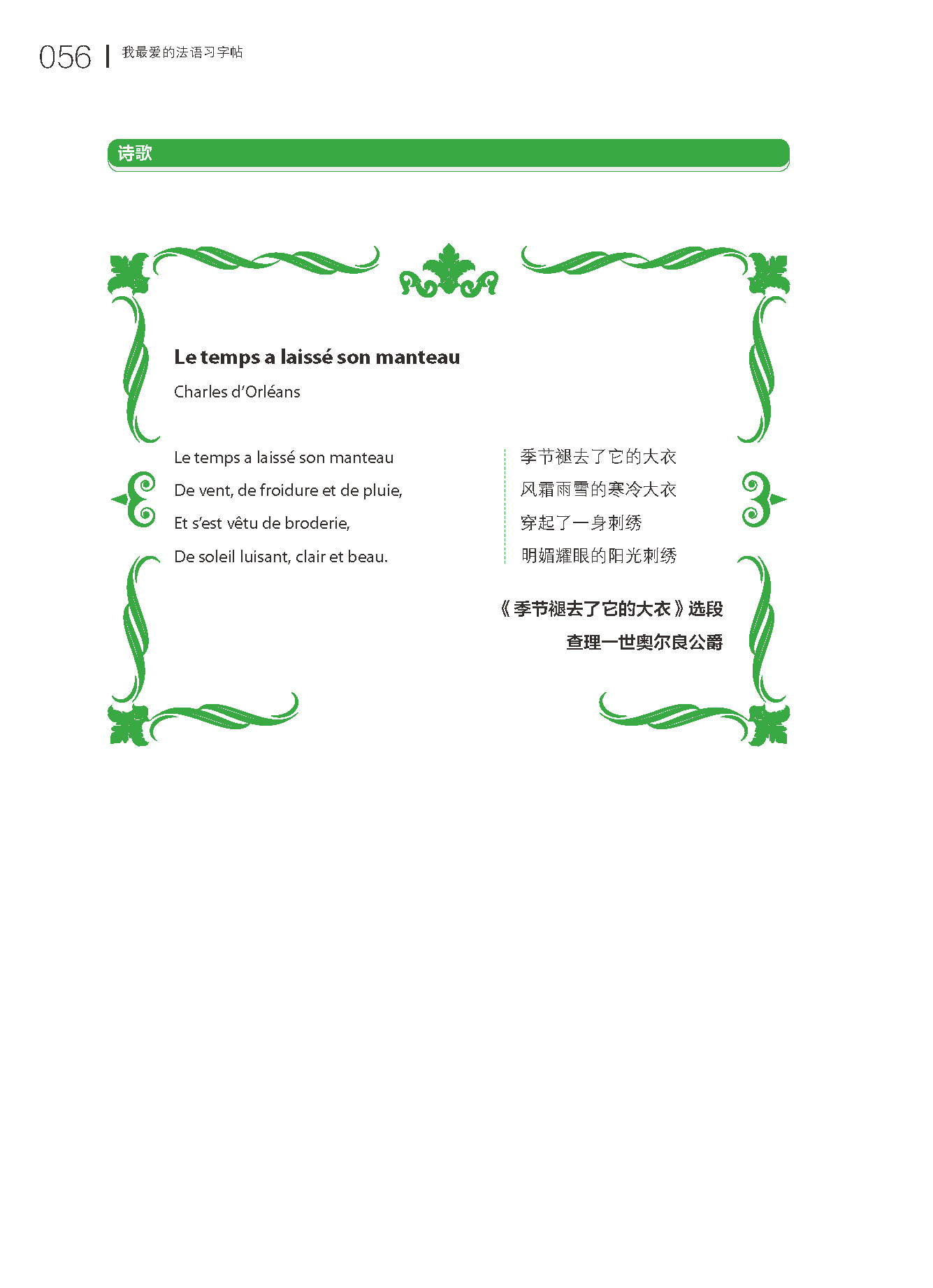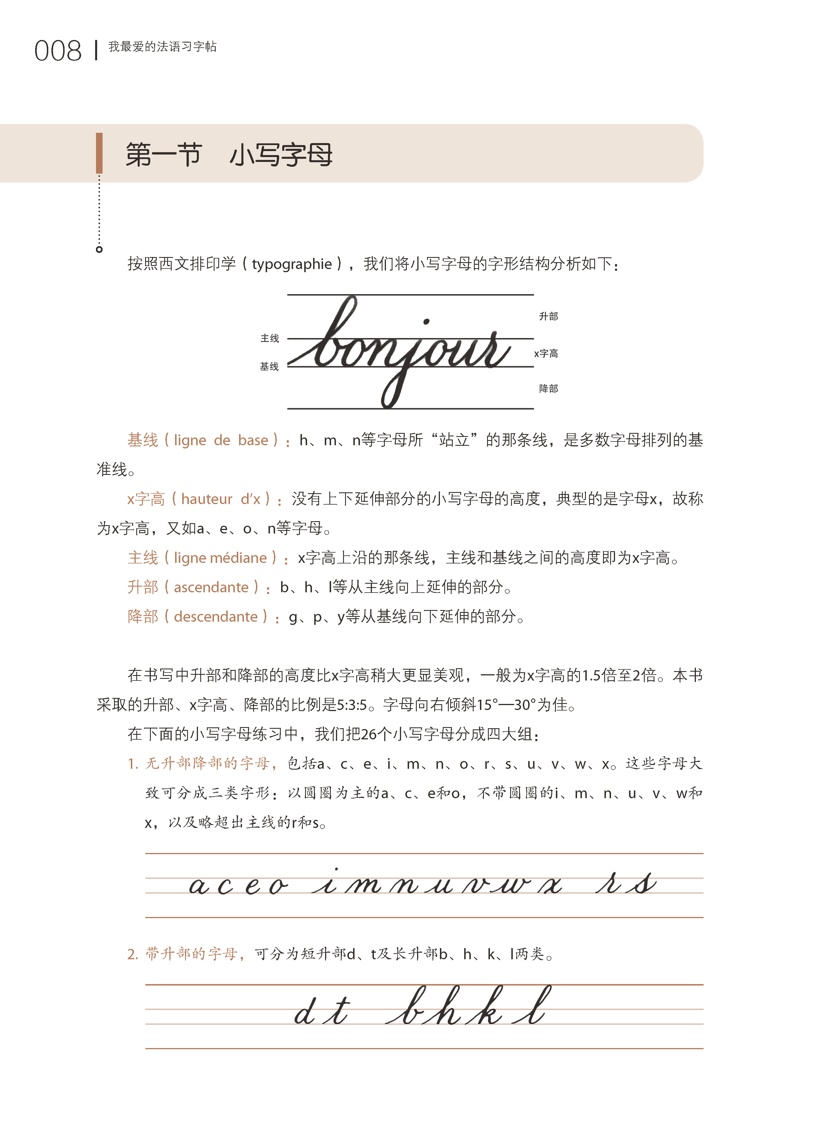 《我最爱的法语习字帖》练字是个慢工出细活的事儿,练过才知道,哪里难,哪里该反复写。《我最爱的法语习字帖》里的字母都是按照一定的规则分组的,有的只占中间一行,有的只带升部,有的只带降部……练好了字母再去练单词,哪些地方该连笔,怎么连,起笔怎样,落笔怎样。练过单词之后再去写句子甚至段落。这方法不但科学,而且操作起来很简单,你只要照着书上的顺序练就好了,假以时日,定能写出自己的风格。