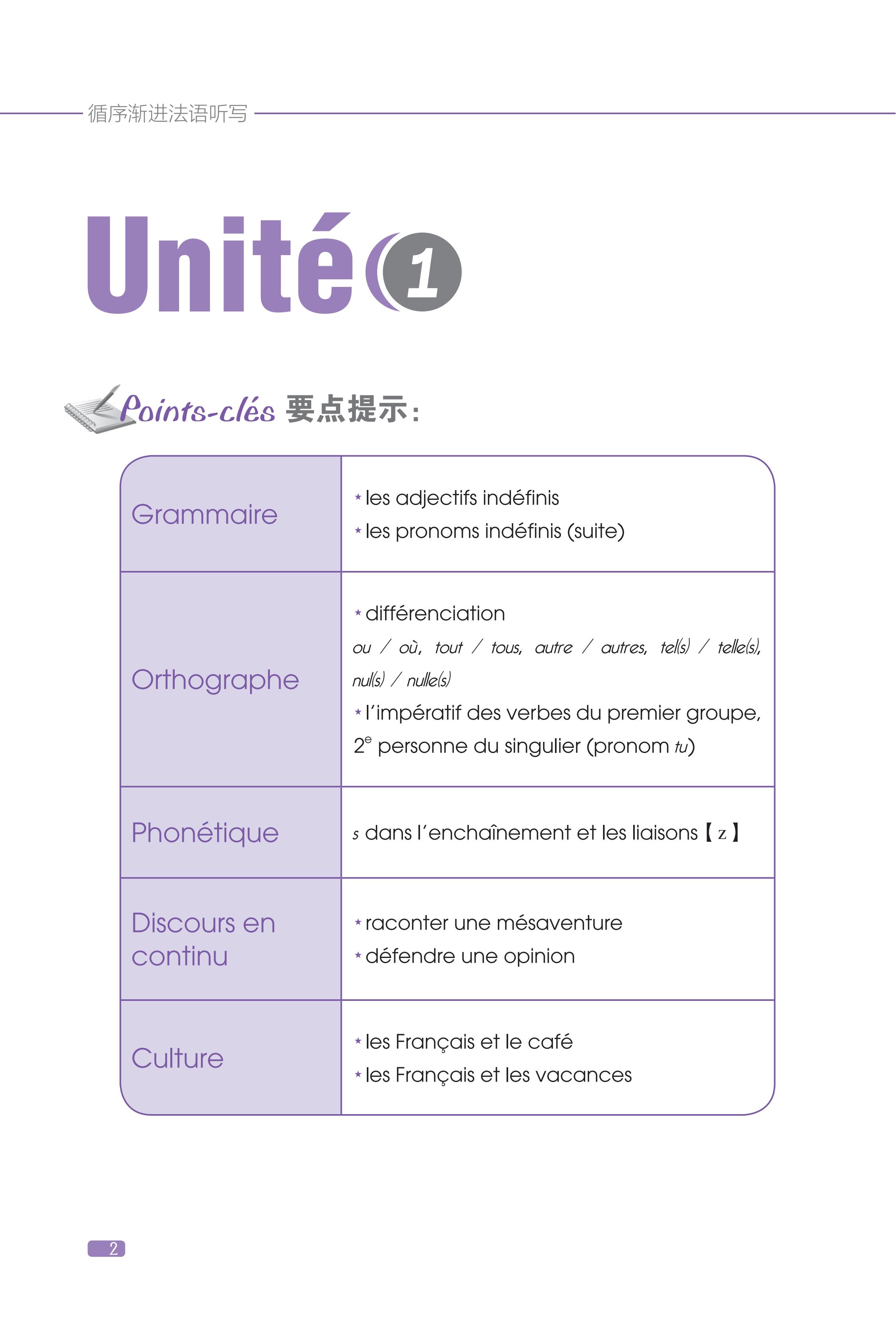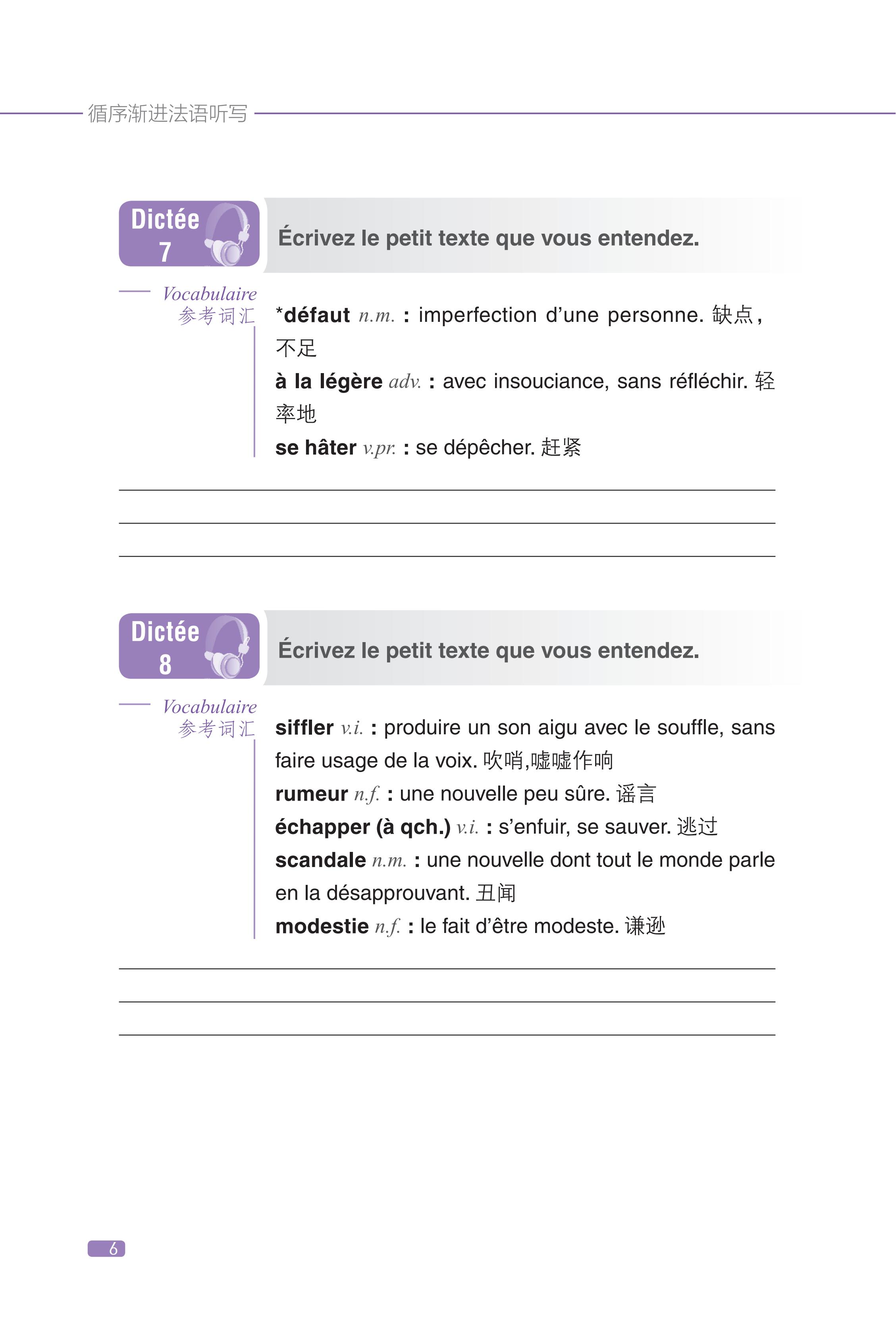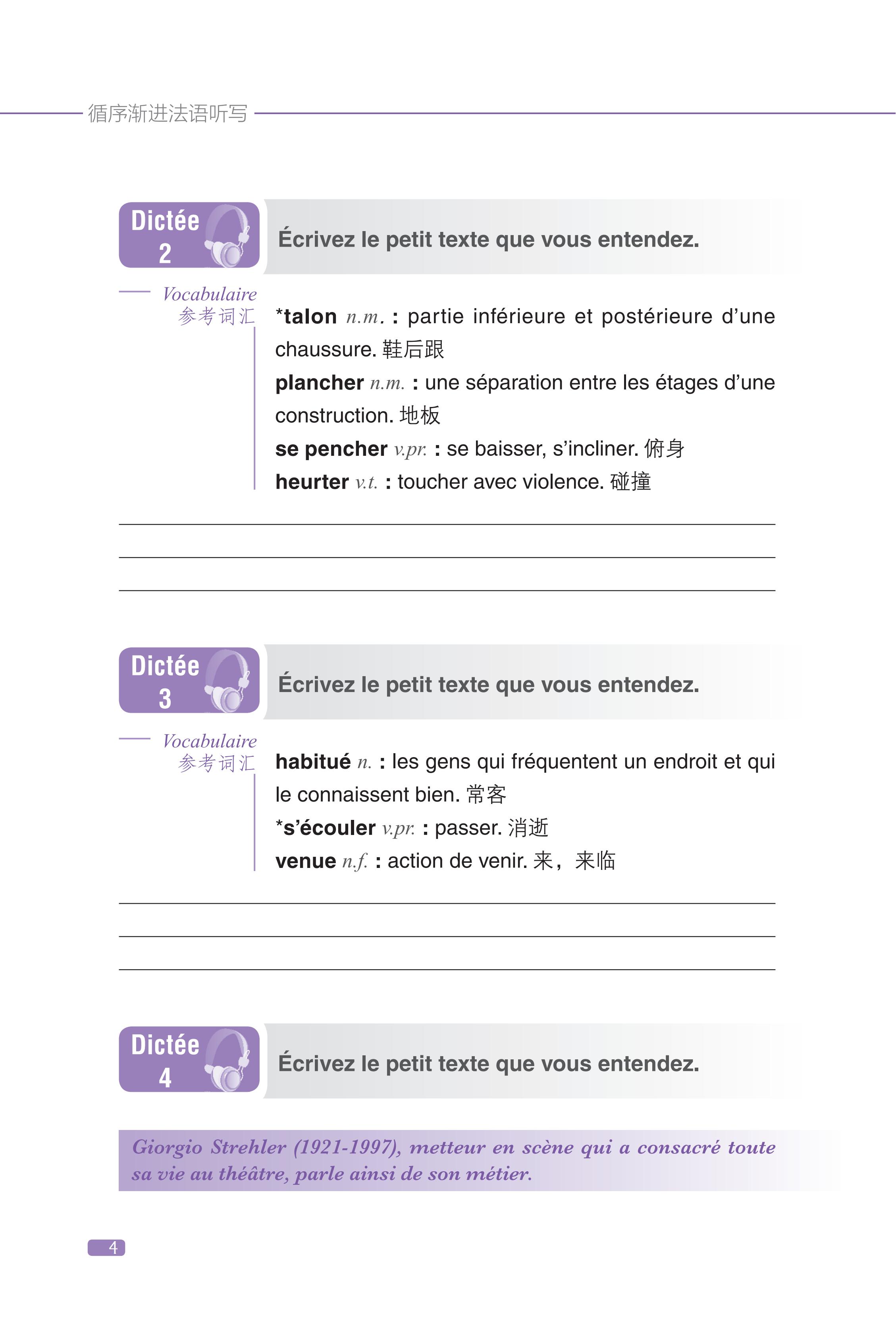 《循序渐进法语听写(提高级)》采取“螺旋式前进”的原则,由浅入深,由简到难,步步深入,循序渐进,在帮助读者巩固已有的法语水平的基础上不断提高读者的听写和理解能力。