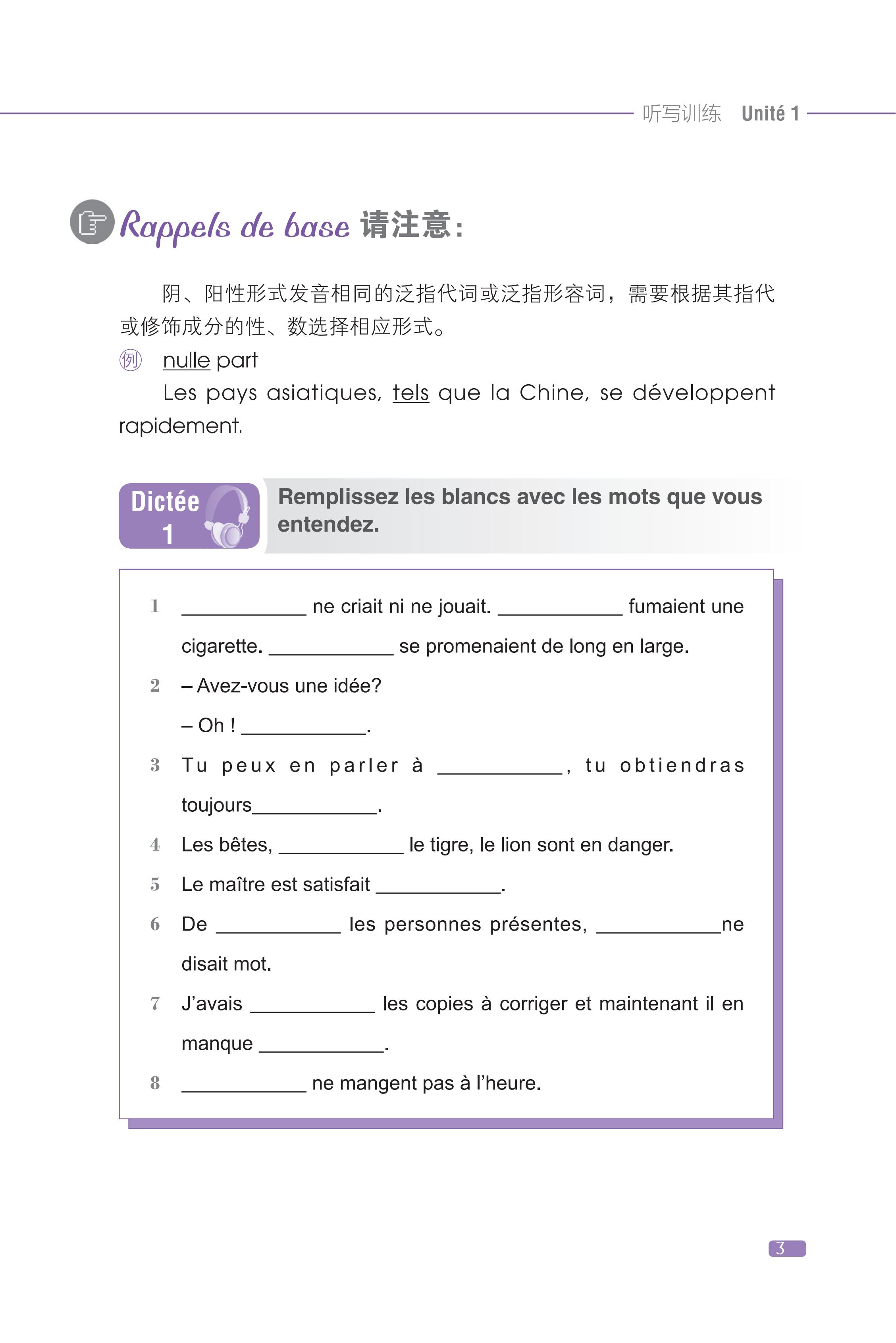 《循序渐进法语听写(提高级)》以语法为主线组织听写练习,段落篇章涉及丰富的主题和题材,涵盖学习、工作、社会生活、历史文化的方方面面。在词汇方面,编者一方面采用学习者在实现语言交流任务中*常用的单词及其用法,另一方面选择能体现文化特色的词汇并发展大纲以外的词汇,来拓展学习者的词汇量。