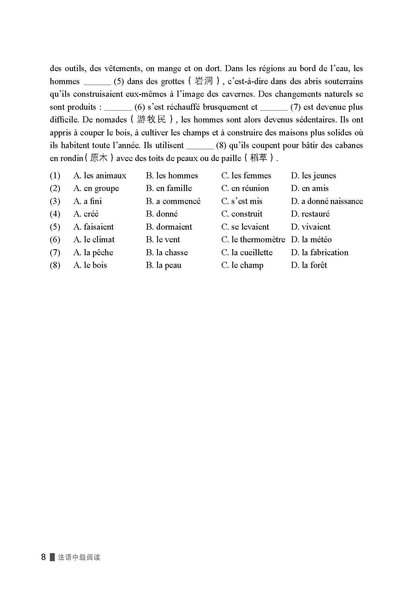 为了帮助学生进一步提高阅读能力,我们在《法语基础阅读》的基础上,仍本着通过语言习得更多知识,通过知识提高语言水平的原则,编写了这本《法语中级阅读(社会文化卷)》。该书选材广泛,覆盖面广,涉及历史、社会、文化、日常生活等诸多方面。全书分为六大部分。每篇文章后有词汇、语言难点注释以及各种不同形式的练习,并附有参考答案。为了使学生在提高阅读能力的同时,提高应试水平,我们根据专业四级考试中完型填空和阅读理解的题型设计了一些练习,希望对学生应对法语专业四级考试有所帮助。 本教材是为法语本科二、三年级学生所编。