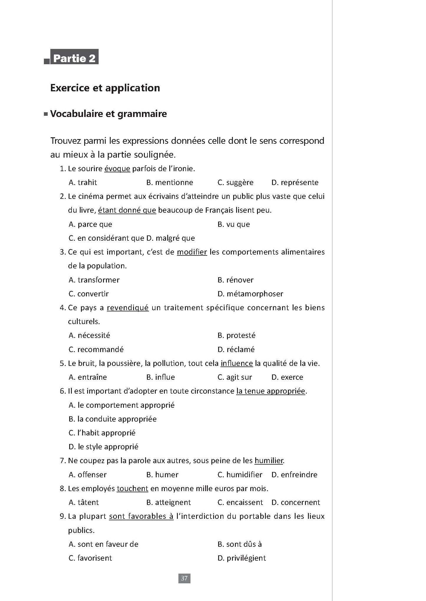 第二部分 Exercice et application 通过一定语境中的词汇选择及汉译法来进行语言点的练习与运用;