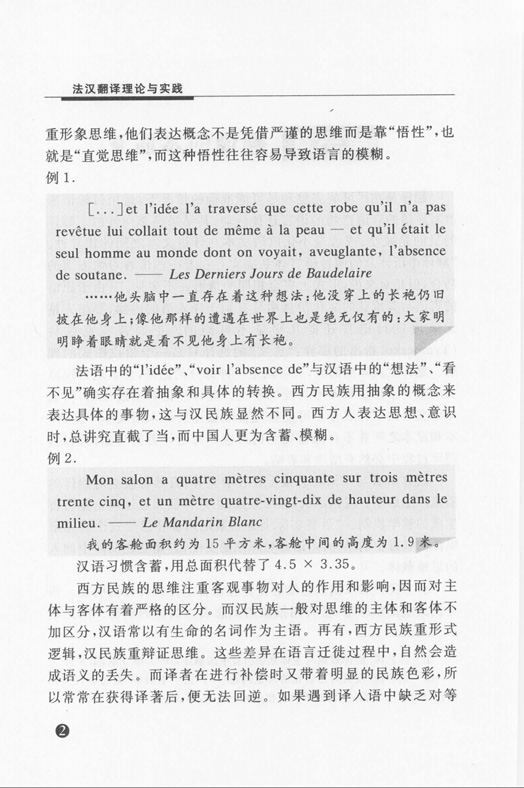 《普通高等教育“十一五”规划教材:法汉翻译理论与实践》的特点为2+3,即两个范畴:理论与技巧;三个层次:词汇层次,句子层次,语篇层次。通过理论与实践的结合,在讲解翻译语言要求的同时,还贯穿着修辞与审美。