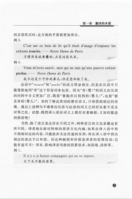 《普通高等教育“十一五”规划教材:法汉翻译理论与实践》的特点为2+3,即两个范畴:理论与技巧;三个层次:词汇层次,句子层次,语篇层次。通过理论与实践的结合,在讲解翻译语言要求的同时,还贯穿着修辞与审美。