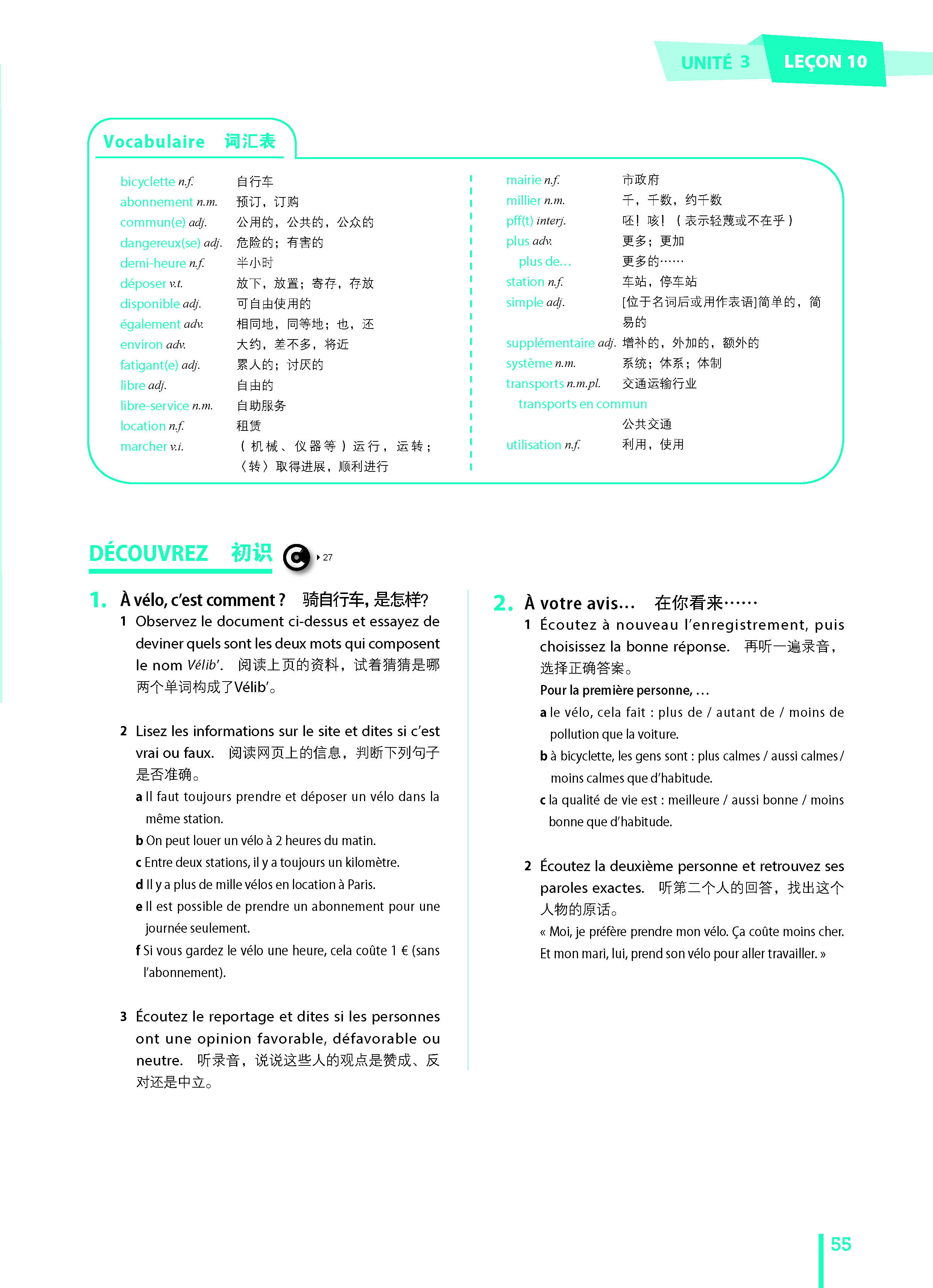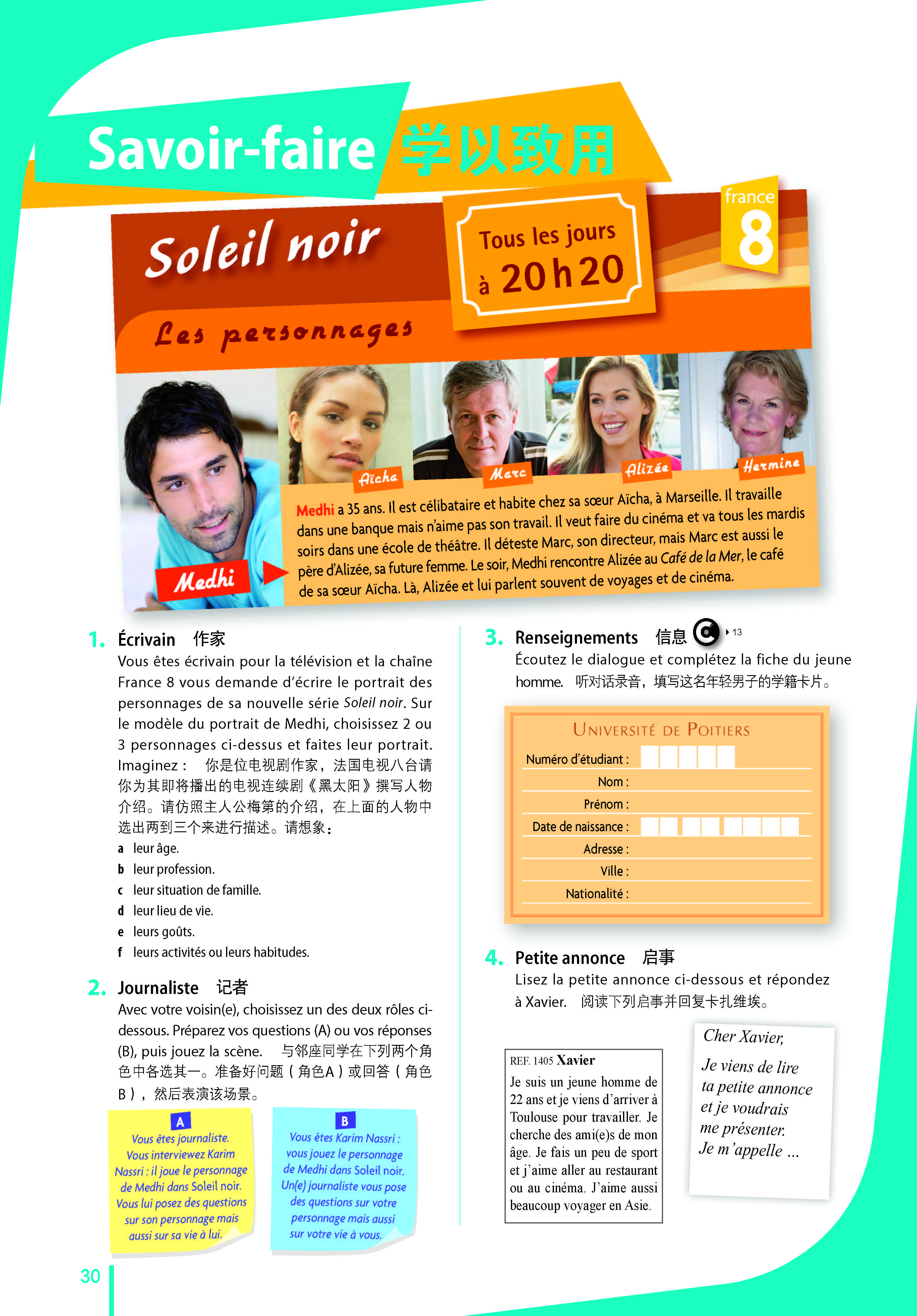 《你好!法语》编写严谨,以“欧洲语言共同参考框架”的学习规范为指导,一至三册分别对应A1、A2、B1三个级别。《你好!法语》理念新颖,吸收“面向行动教学法”的精髓,即学即用,学习者担纲主演,以完成交际任务的方式寓学于乐。 《你好!法语》教程立体化,学生用书以地道的语料为基础,配合适合中国学习者接受习惯的语法讲解;练习册紧密贴合学生用书,加重“读、写”技能的训练和培养;教师用书“复习 深入 提高”,教师和学生可各取所需;DVD-ROM高互动性,实时跟踪个人学习进度。 《你好!法语》集结了的编写团队,原版作者为首套多媒体法语教程《Reflets走遍法国》主创人员之一,改编者为北京语言大学法语教学专家和经验丰富的一线教师。 《你好!法语》拥有开放的、动态的学习空间,外研社综合语种出版分社网站和高等学校法语专业教学管理平台提供相关资源下载和学习心得交流,平台“外研社法语”欢迎各位读者前来分享你的学习故事。