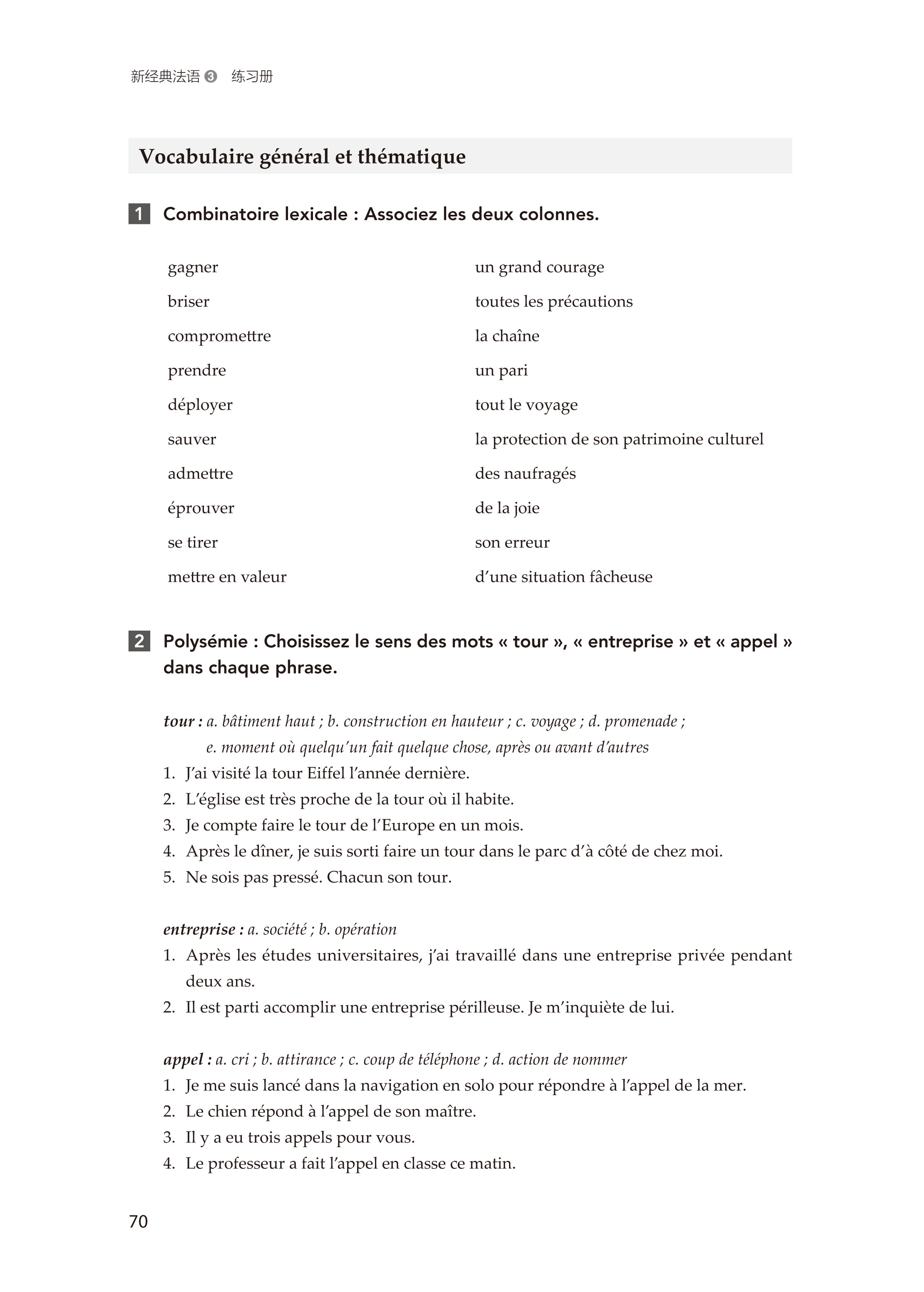《新经典法语3练习册》是配合《新经典法语3学生用书》使用的同步练习手册。内容与学生用书同步,根据学生用书的安排,共分为4个单元,14课。每课练习包含四个板块:语法练习、基本词汇和主题词汇练习、听力练习以及阅读理解训练。练习题型新颖,每课一练,听说读写译能力训练并重,通过丰富多样的训练习题辅助学生真正把语言基本功训练落到实处。