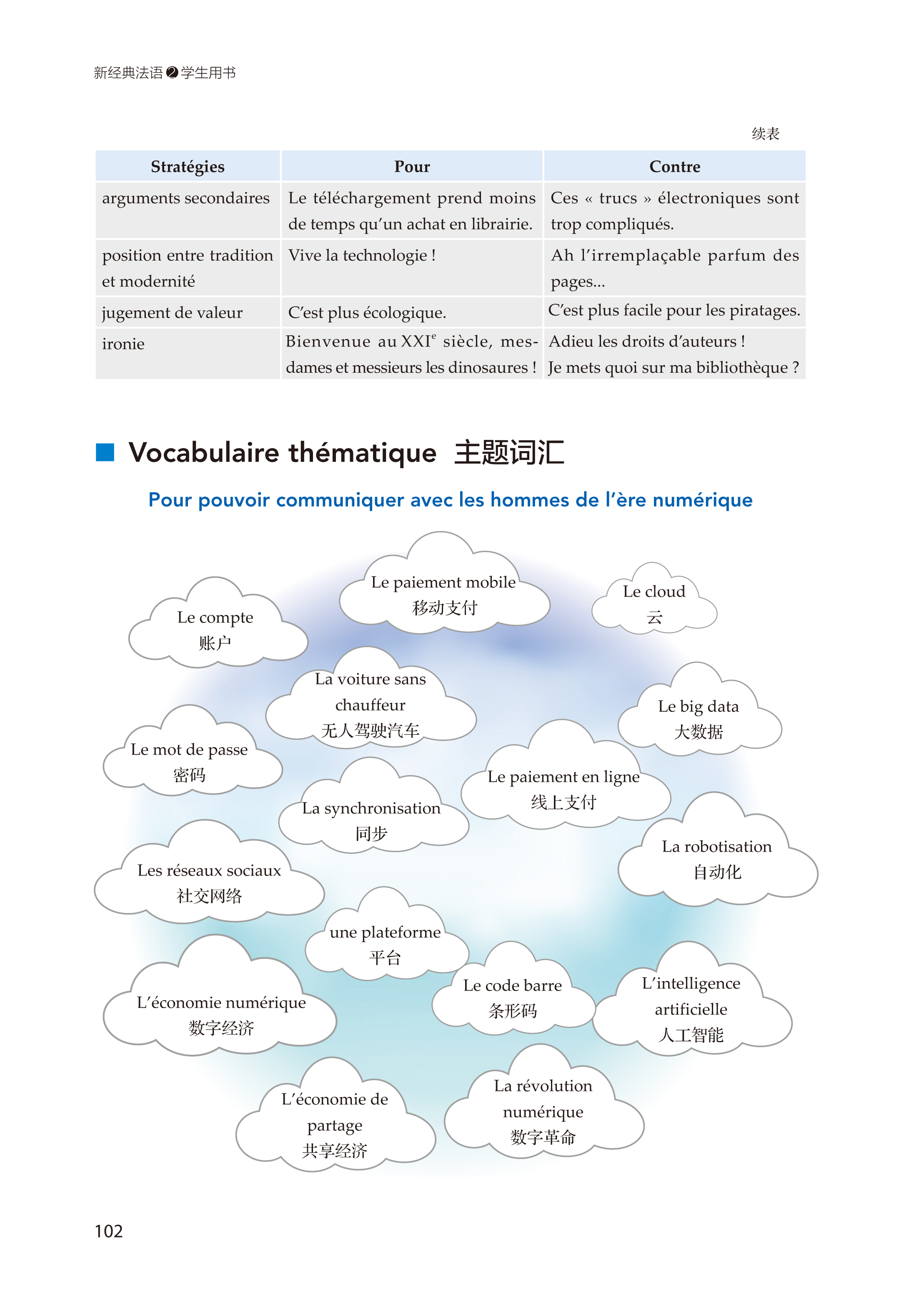 除此之外,第二册还有许多新的亮点值得关注。首先,课文主题从实用性向思辨性过渡。其次,更多使用真实语言素材,语料的呈现形式也更加多样:文学作品节选、报章杂志选篇、漫画、社交网络、歌曲、知识竞赛、食谱等载体尽显各自的魅力。再者,这一册内容的选材还在时间和空间这两个维度上做了更多的拓展。使用者会在这一册书中见到法国当代作家的介绍及作品节选。空间上,法国不再是唯一的对象国,法语国家与地区的相关国家、人物和作品频繁出现于各大板块,以便用多元文化拓宽学习者的视野。