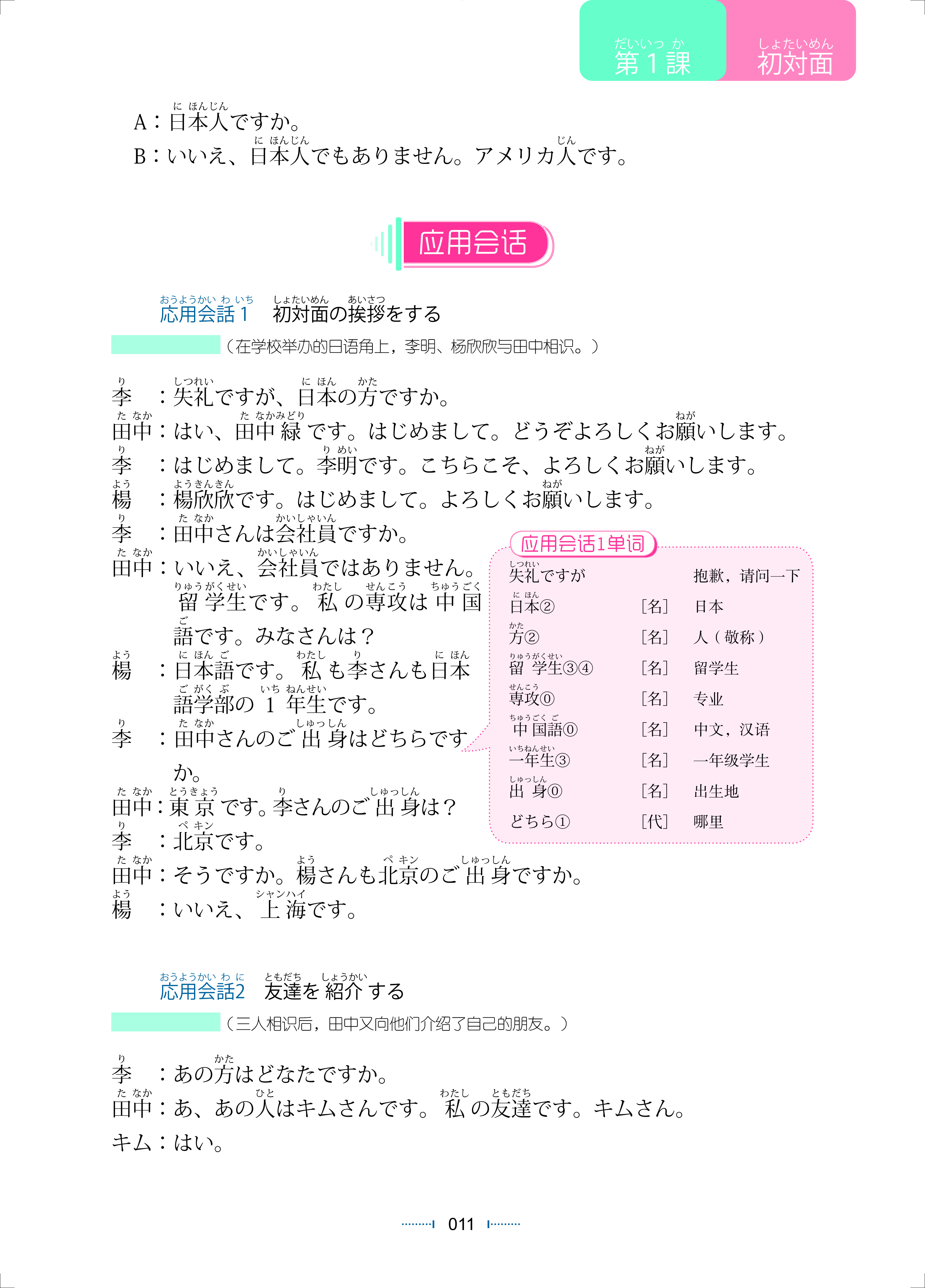 《新经典日本语基础教程第一册(第二版)》为新经典日本语基础教程系列的第一册教材,包含“发音”和14课。本教材是以主人公“李明”和“杨欣欣”(日语专业一年级学生)进入大学后,在于周围老师、同学、朋友的交往中逐渐成长为主线展开叙述的。本册的会话场景设在中国,符合中国大学生的认知规律。通过本册的学习,学生可以掌握日语发音,识别、书写日语假名以及使用所学的日语进行简单的交际。