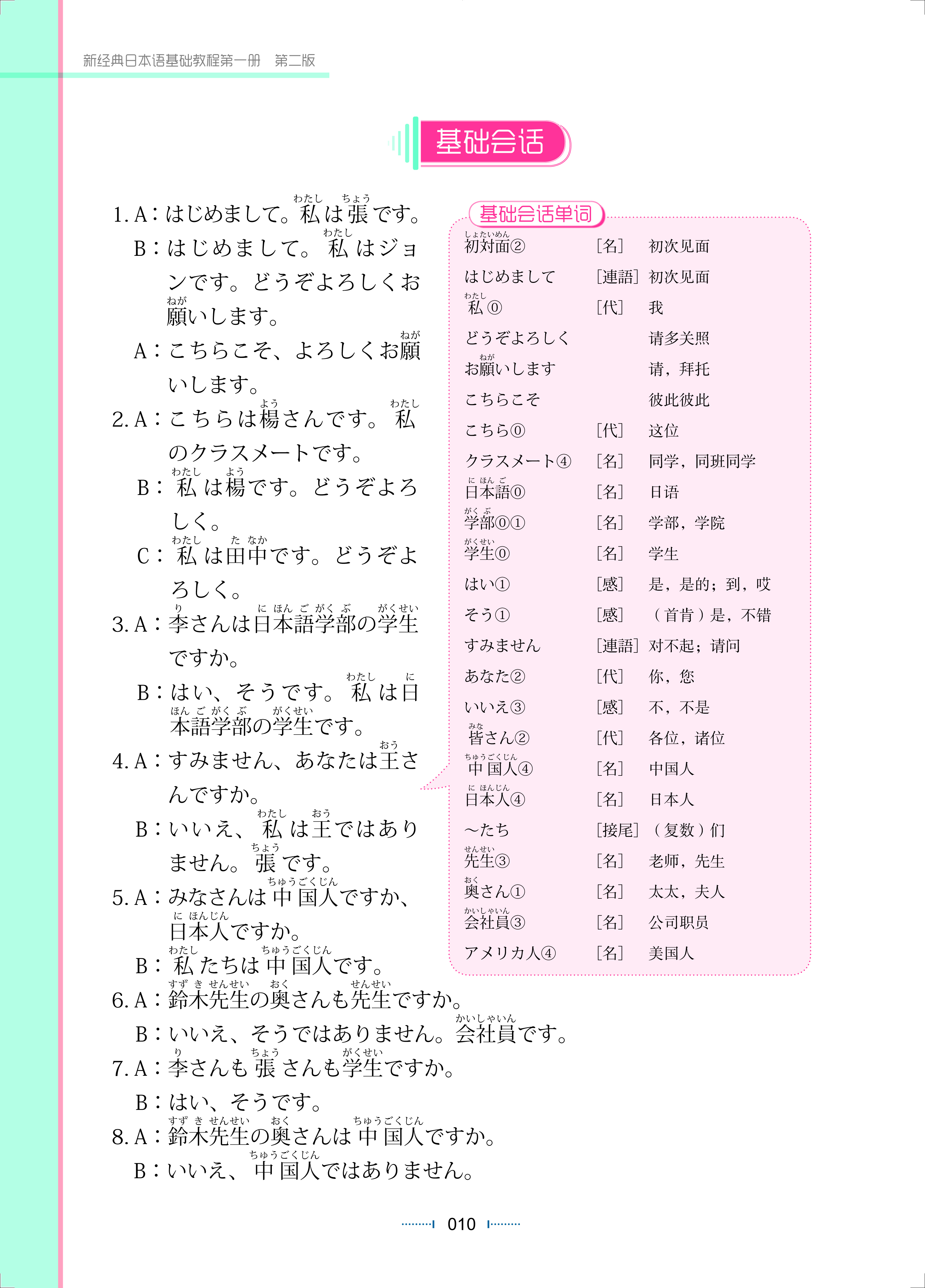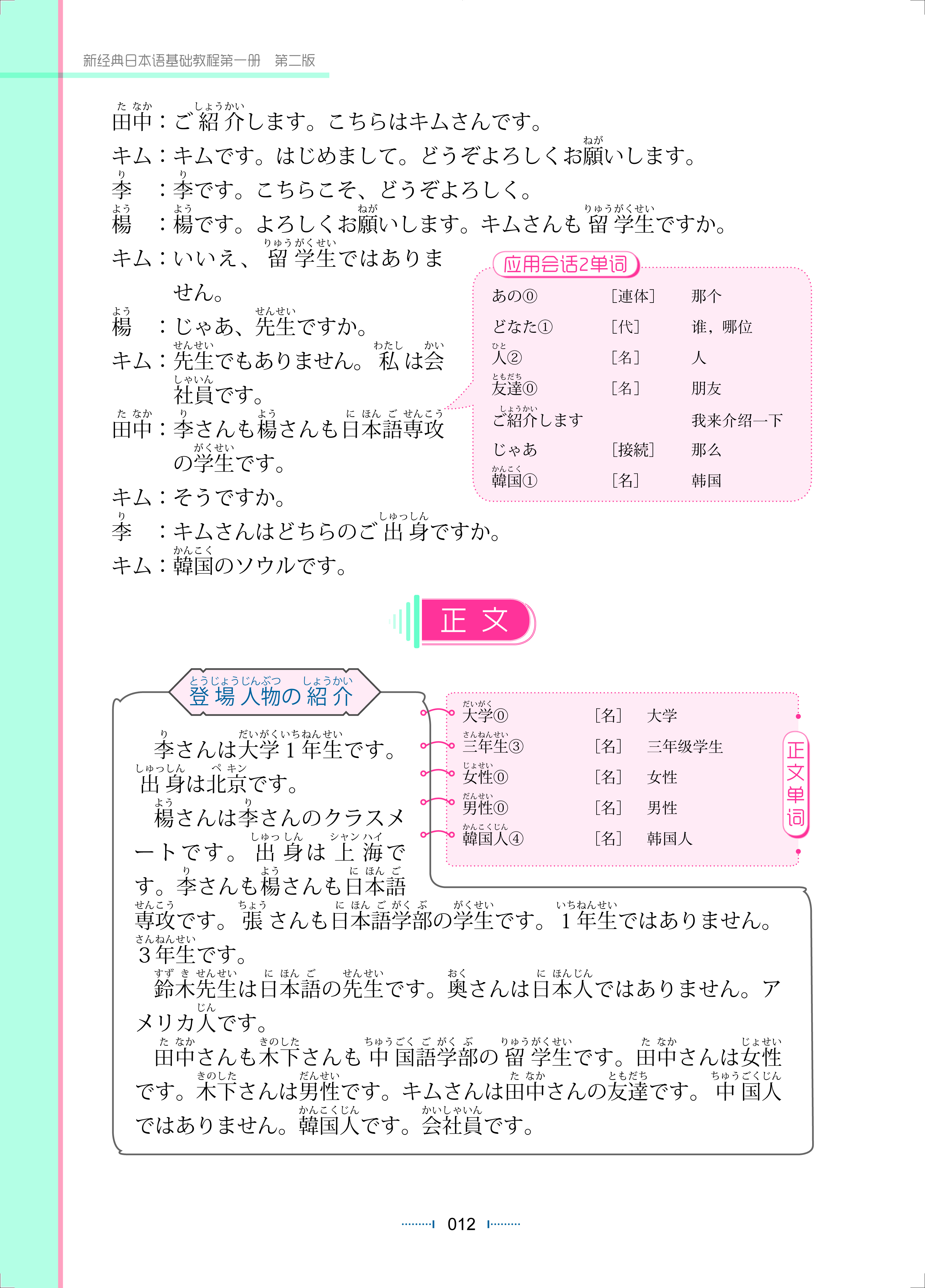 《新经典日本语基础教程第一册(第二版)》为新经典日本语基础教程系列的第一册教材,包含“发音”和14课。本教材是以主人公“李明”和“杨欣欣”(日语专业一年级学生)进入大学后,在于周围老师、同学、朋友的交往中逐渐成长为主线展开叙述的。本册的会话场景设在中国,符合中国大学生的认知规律。通过本册的学习,学生可以掌握日语发音,识别、书写日语假名以及使用所学的日语进行简单的交际。