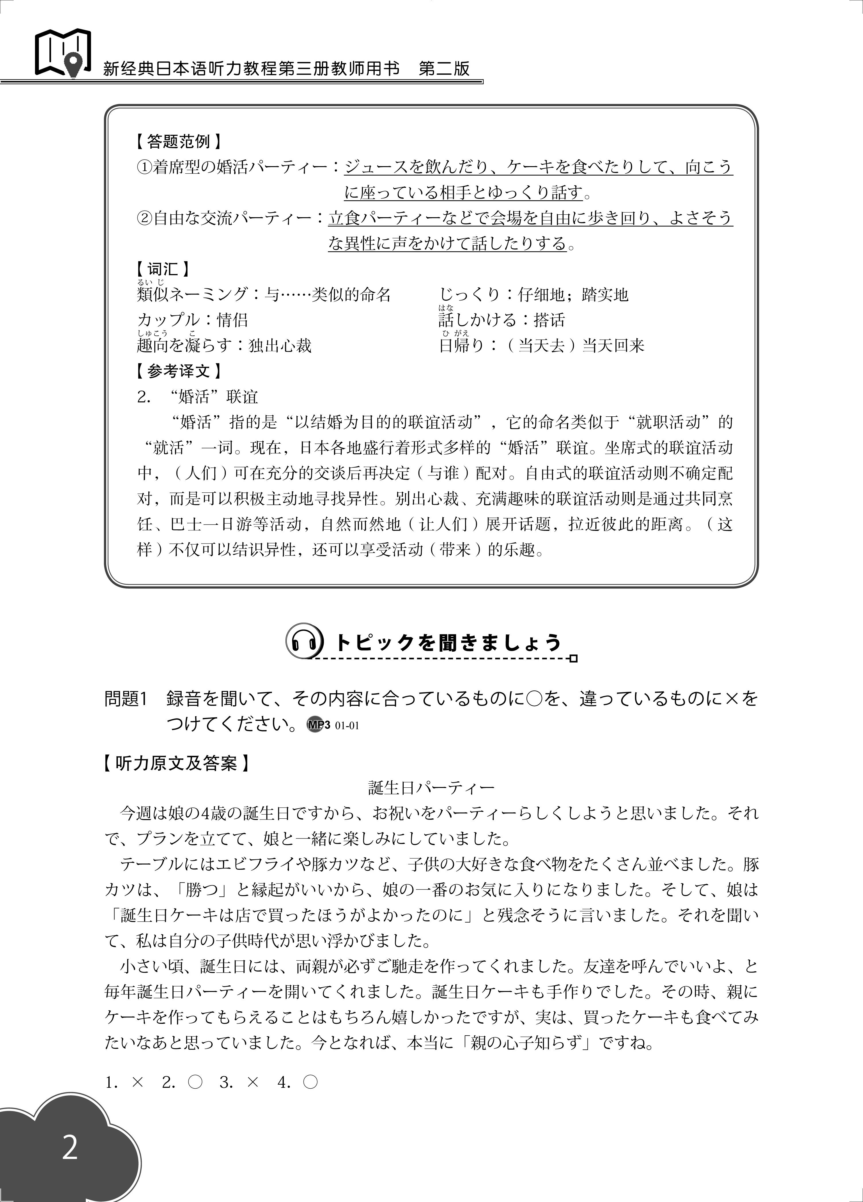 《新经典日本语听力教程第三册教师用书(第二版)》为《新经典日本语听力教程第三册(第二版)》的配套教师用书,是以使用《新经典日本语听力教程第三册(第二版)》授课的教师以及使用该教材自学的日语初级学习者为对象,精心编写的教学指导用书。除了提供听力原文及答案外,重点为教师和学习者提供了方便教师教学以及学生拓展知识的"解析"部分的内容。