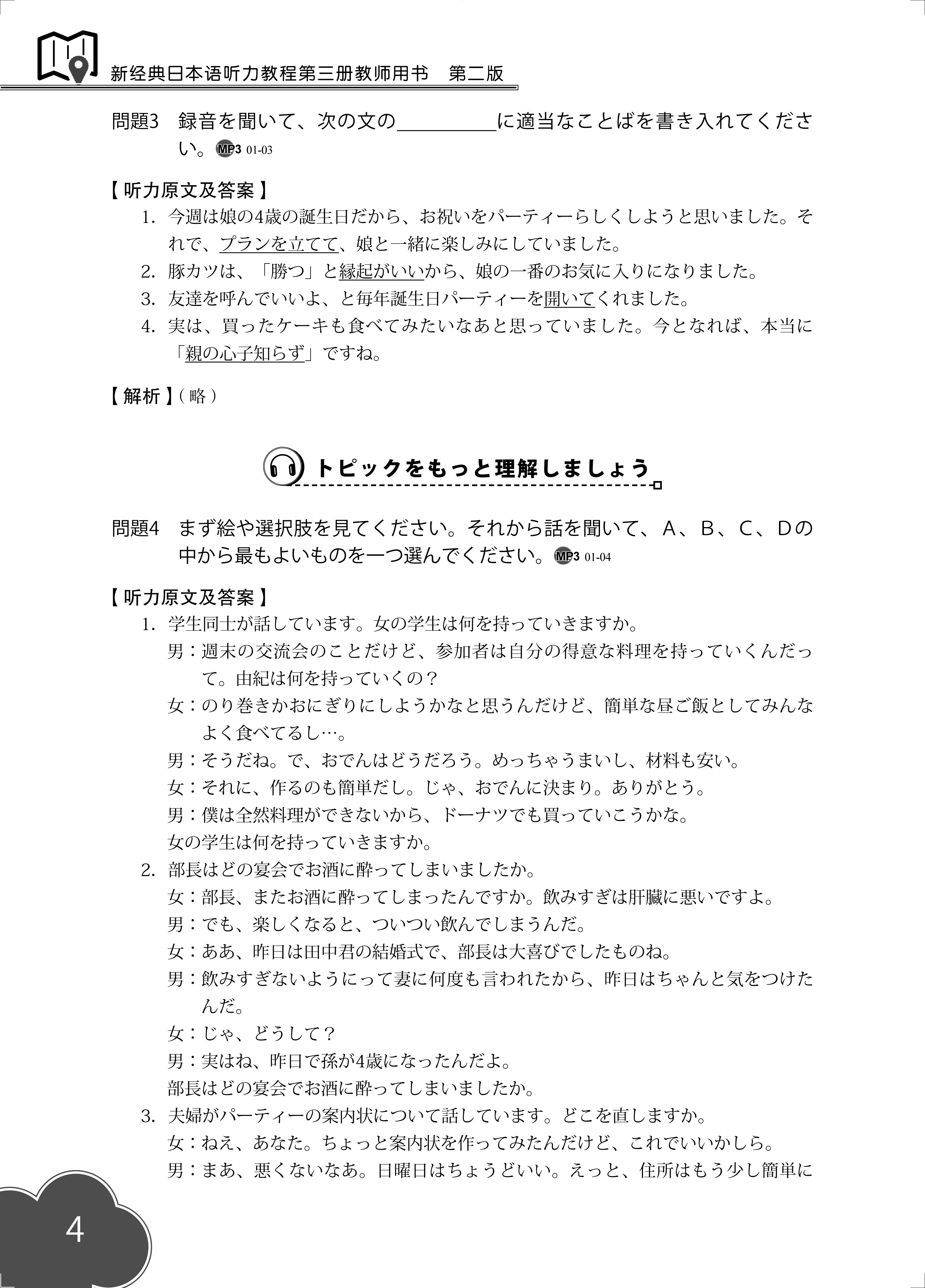 《新经典日本语听力教程第三册教师用书(第二版)》为《新经典日本语听力教程第三册(第二版)》的配套教师用书,是以使用《新经典日本语听力教程第三册(第二版)》授课的教师以及使用该教材自学的日语初级学习者为对象,精心编写的教学指导用书。除了提供听力原文及答案外,重点为教师和学习者提供了方便教师教学以及学生拓展知识的"解析"部分的内容。