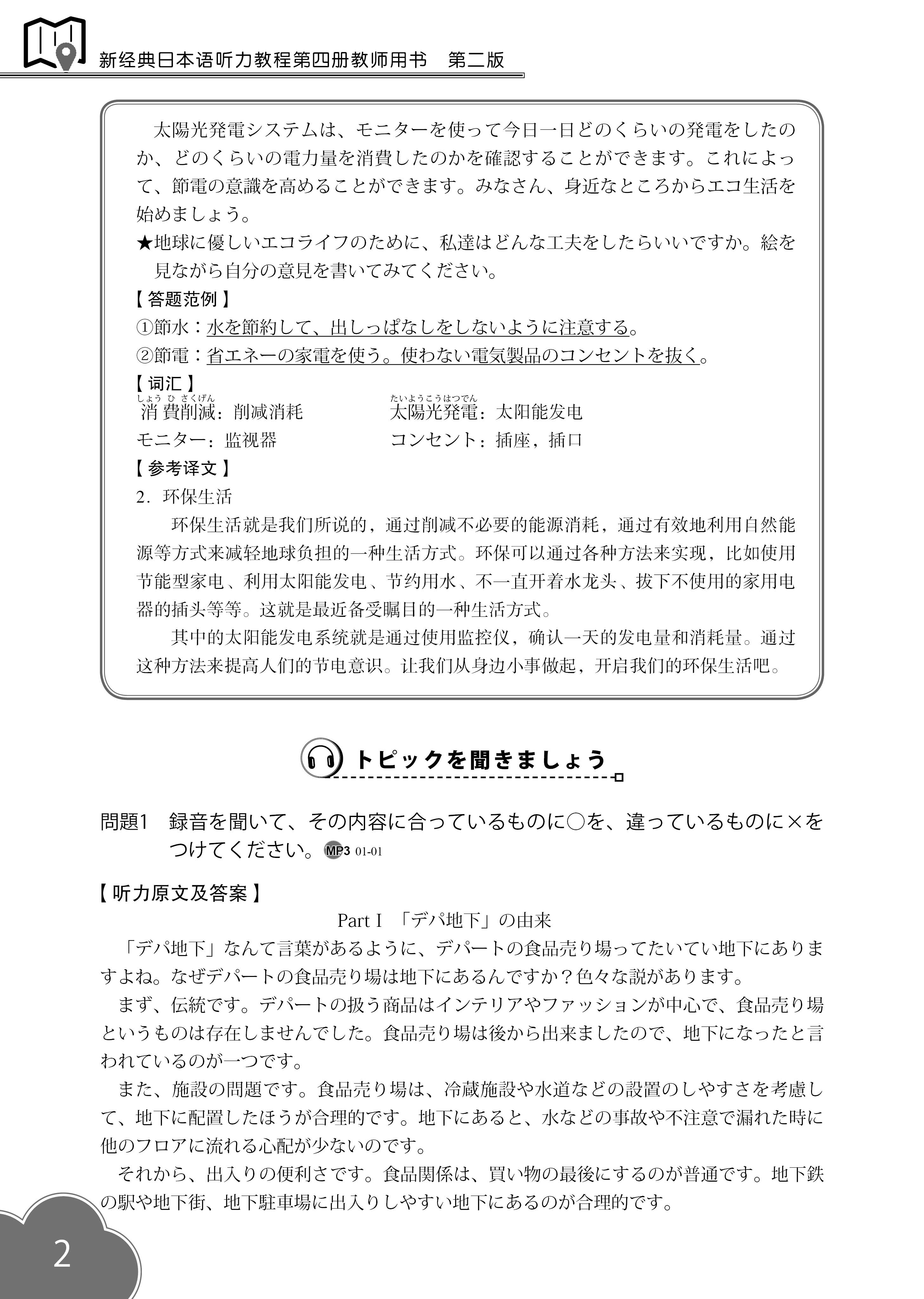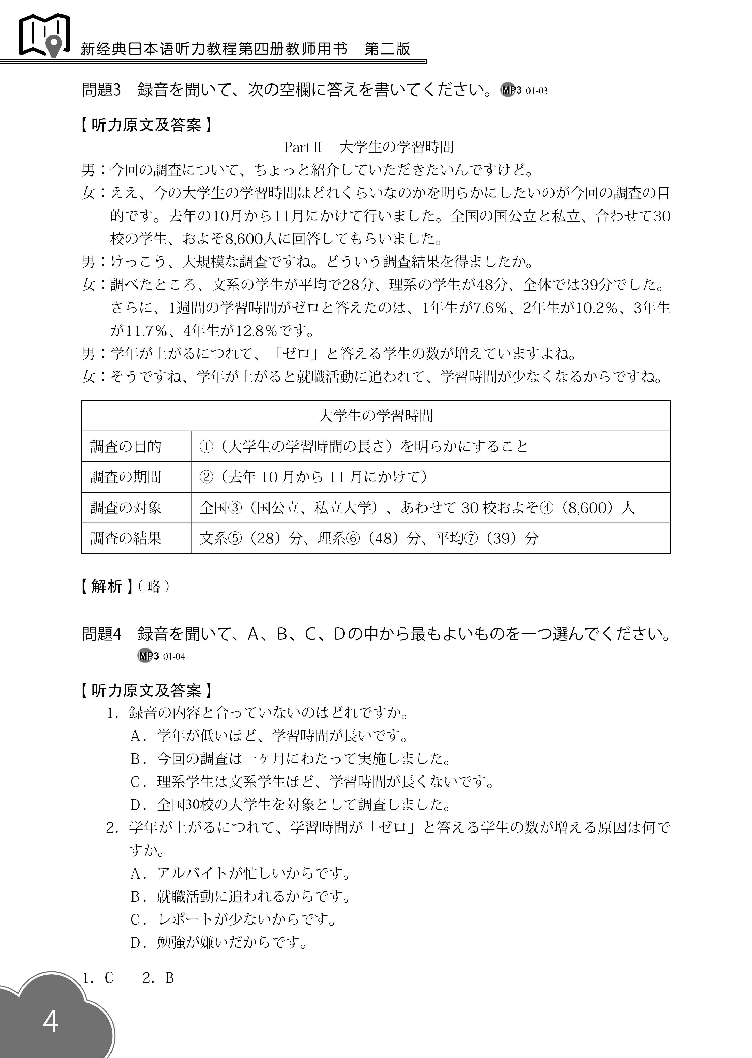 《新经典日本语听力教程第四册教师用书(第二版)》本套教材分别设计了"听辨""听选""听写""跟读""试说""听译"等环节,强化语言输入与输出的衔接,以"写、说、译"来促进学生听解能力的培养,*终实现提高语言综合运用能力的教学目标。