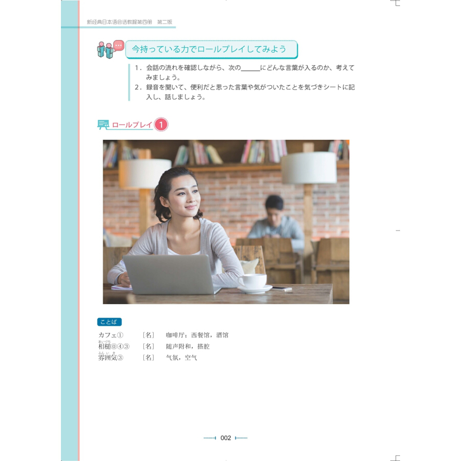 《新经典日本语会话教程第四册(第二版)》为"新经典日本语—会话教程"系列的第4册教材,共15课。本教材在课堂组织中强调学生的全程参与。教师在课堂上无需讲授句型、语法、词汇等语言知识,主要任务是组织、引导学生完成语言运用练习。会话教程的主要任务是完成对学生听说能力的专项训练。完成这一训练较为有效的方法是问答法。该教材通过严格的问答法训练使学生从"分かる"转化到"できる"。