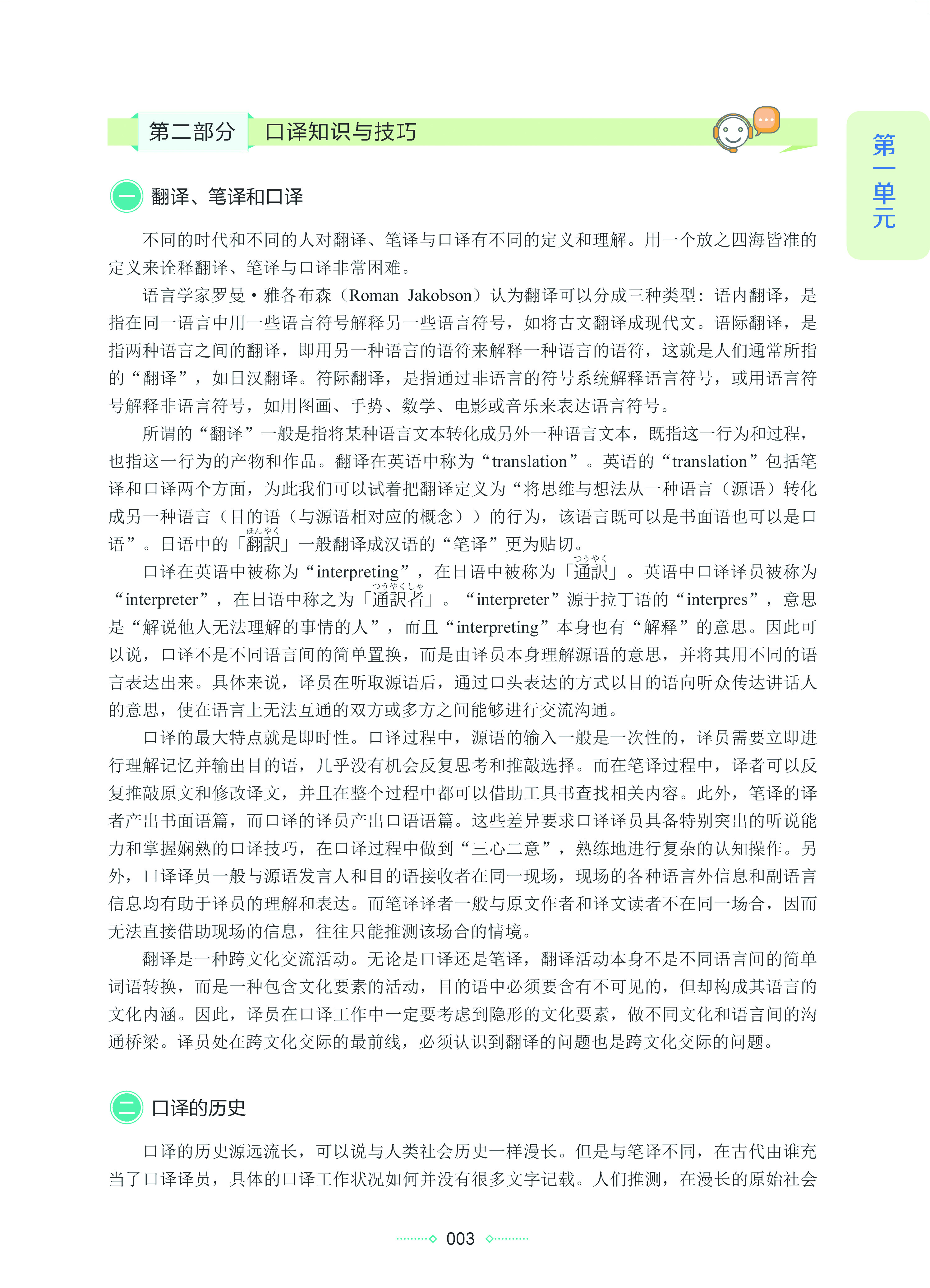 《新经典日本语口译基础教程》系列图书供日语专业高年级或具有同等日语能力的学习者使用,在编写中主要体现了以下几个特点: