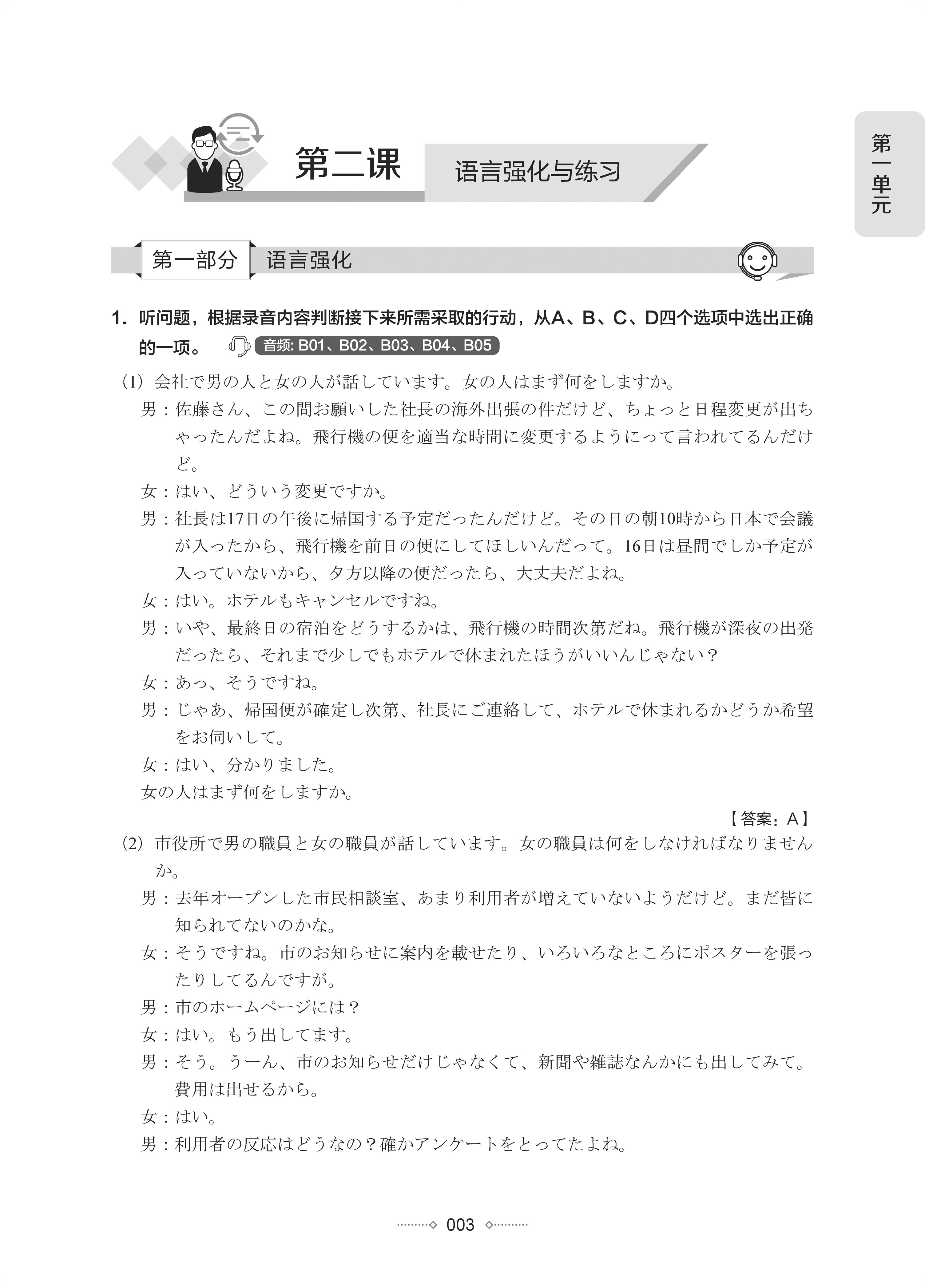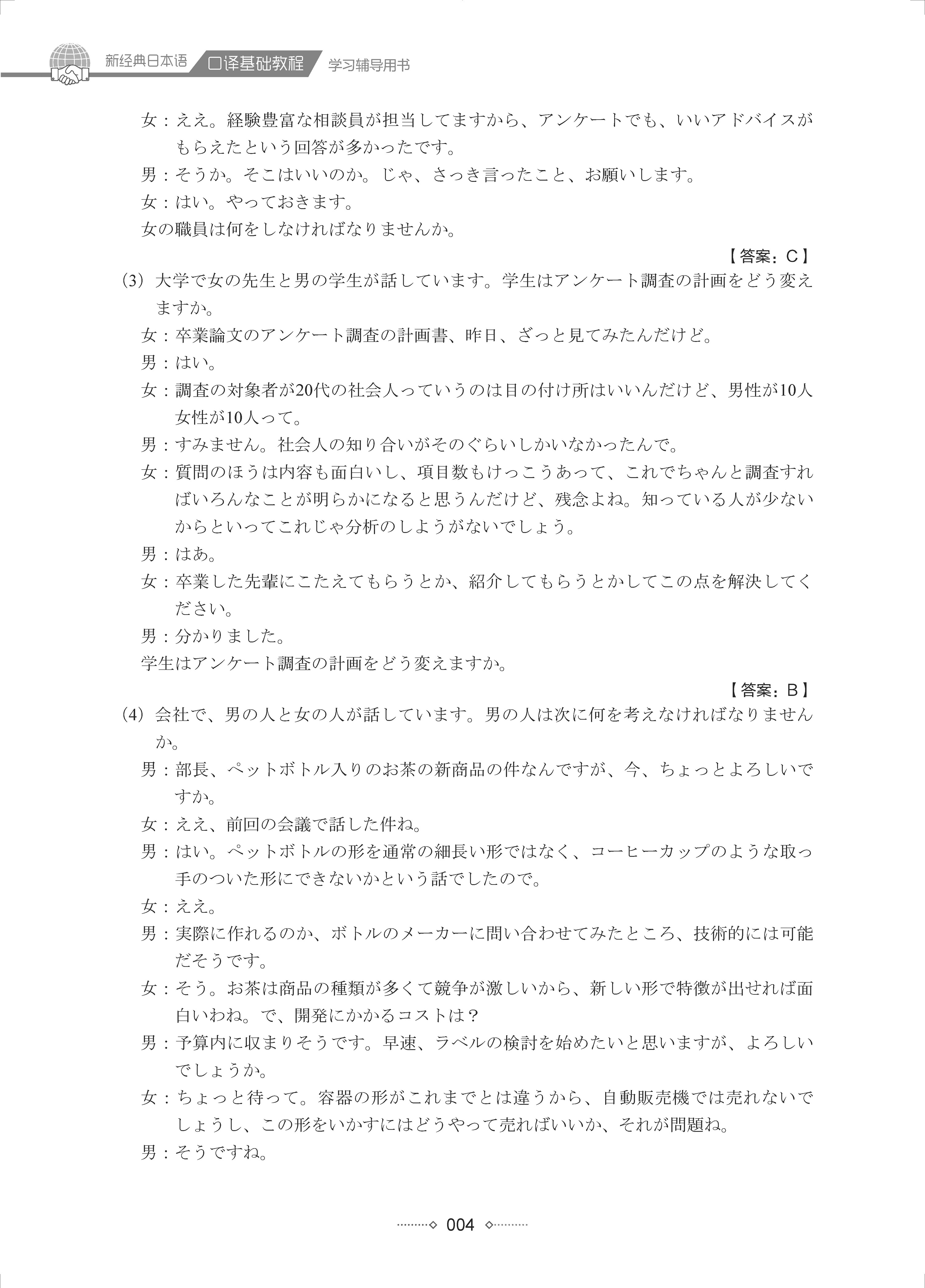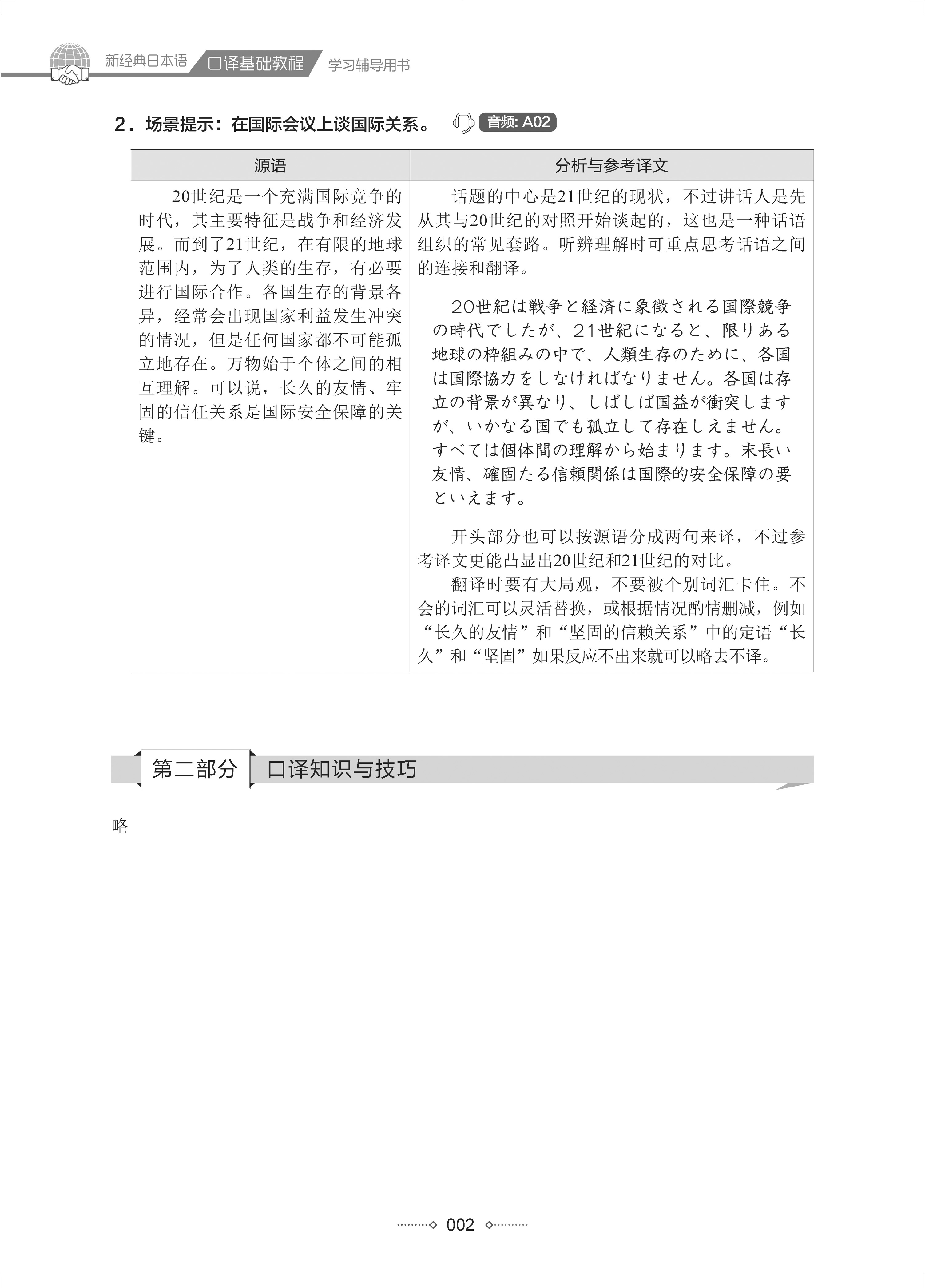 《新经典日本语口译基础教程学习辅导用书》是《新经典日本语口译基础教程》的学习辅导用书,特点如下:对主教材中使用的所有素材,除根据练习需要提供源语文本、参考答案或参考译文以外,还附有对源语结构的梳理乃至对口译技能训练中重点、难点的解析。这不仅利于教师在教学中使用,也便于学习者在自主学习中查漏补缺。还有一点值得注意的是,本书提供的参考译文,尤其是日语参考译文,均考虑到了口译现场的即时性特点和口译入门者的学习水平,重在启发学习者的思考。
