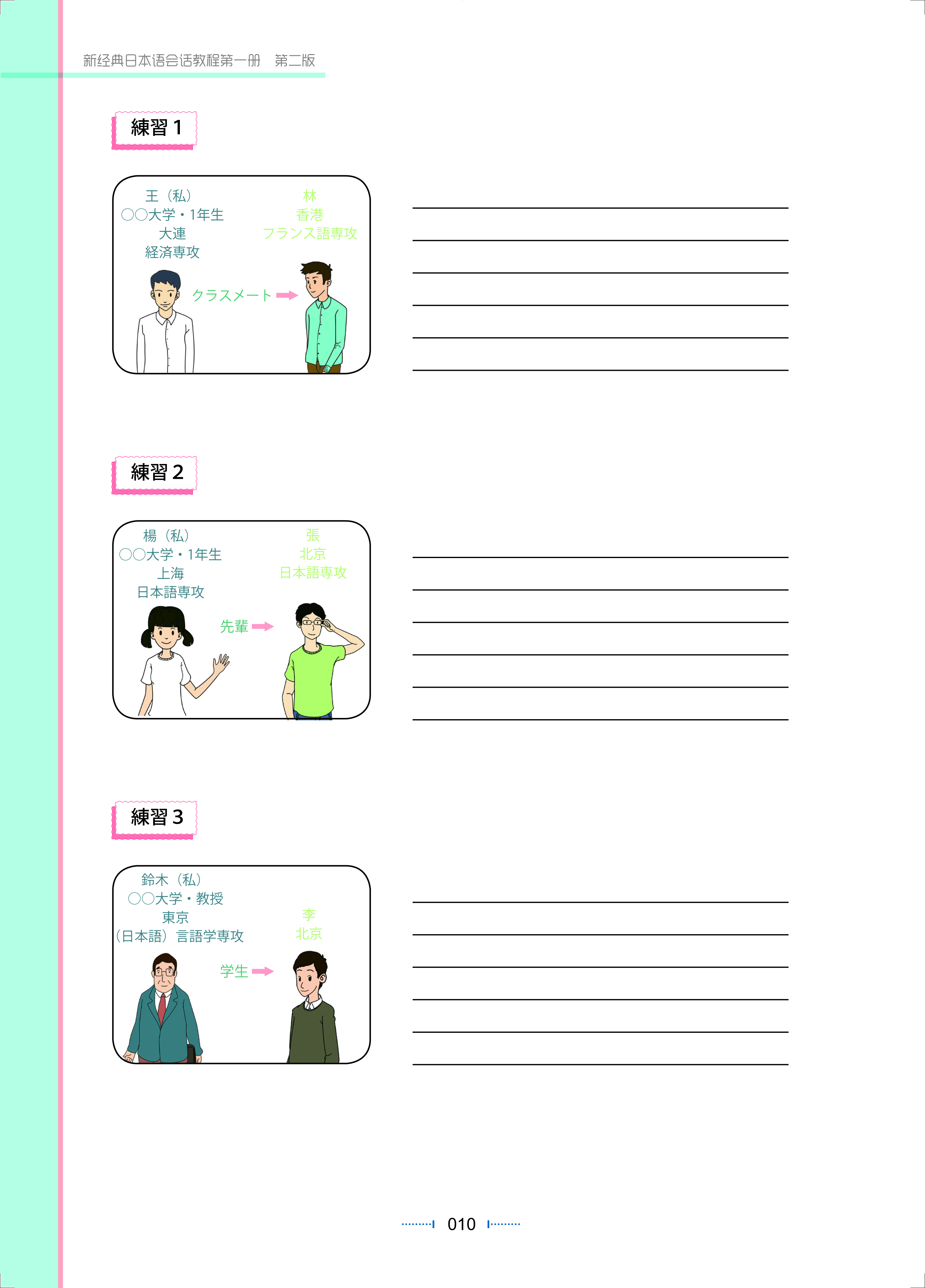 《新经典日本语会话教程第一册(第二版)》是以中国高等院校零起点的日语专业本科学生为对象,以培养学生听说能力为目标的教材。本教材以《高等院校日语专业基础阶段教学大纲》为依据,参照《日语教育标准2010》(日本《国际交流基金会)对相应学习阶段的会话能力的要求,在学习和吸收国外外语教学的先进理念和方法的基础上,借鉴国内外已经出版的优秀教材的经验,结合中国日语本科教学的现状和大纲要求编写而成。《新经典日本语会话教程(第二版)》(第一、二册)主要是以语法(「文法」シラバス)为纲,培养学习者的基础会话能力。一年级水平的日语学习者应该基本能流利地表述日期、星期、时间、数量,熟练地进行日语用言的基本变形(连用、可能、使役、被动),较准确地使用已经学习过的日语授受表达方式、简单的敬语等。