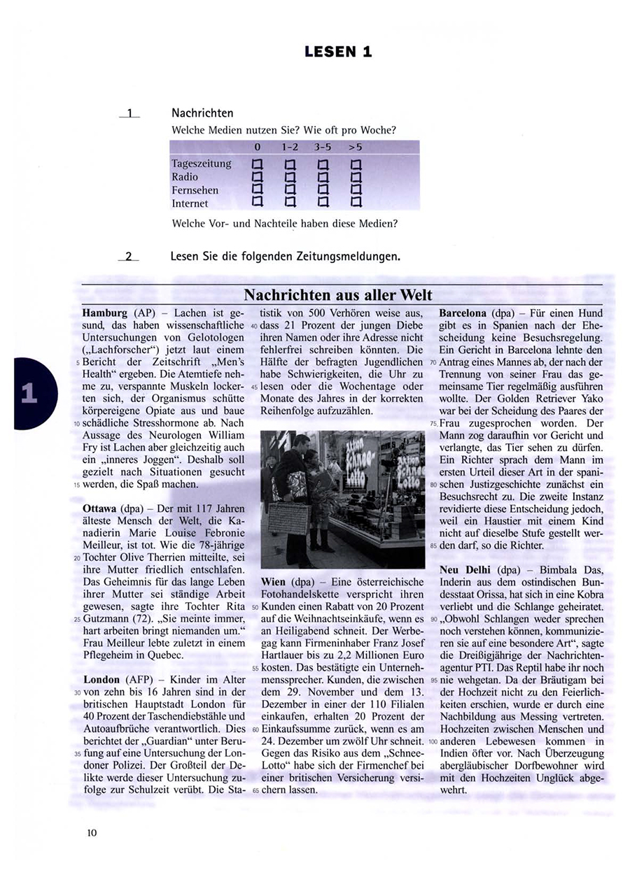 《新标准德语强化教程(中级)》系列教程的内容及语言水平参考德国歌德学院的中级德语考试——ZMP(ZentraleMittelstufenprüfung),学完本套教材将达到欧洲语言共同参考标准C1水平。教材内容由各个独立的板块组成,学习者既可以按照课本顺序学习,也可以选出自己感兴趣的重点单独练习。《新标准德语强化教程(中级)1学生用书》共10课,每课均有独立主题,分别由以下独立板块构成:听、说、读、写、词汇、语法。《新标准德语强化教程(中级) 3 学生用书》语言难度为欧洲语言共同参考标准C1。