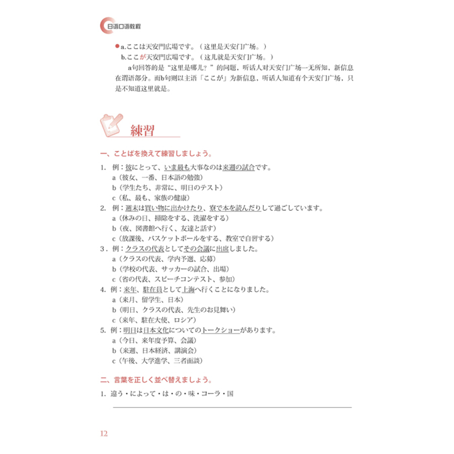 《日语口语教程》以让学生掌握自然流畅的日语口语为目标,课文采用了日常生活中使用频率高、实用性强并且容易上口的语言材料。会话中的情景主要围绕大学生的校园生活展开,易于为学生所接受。