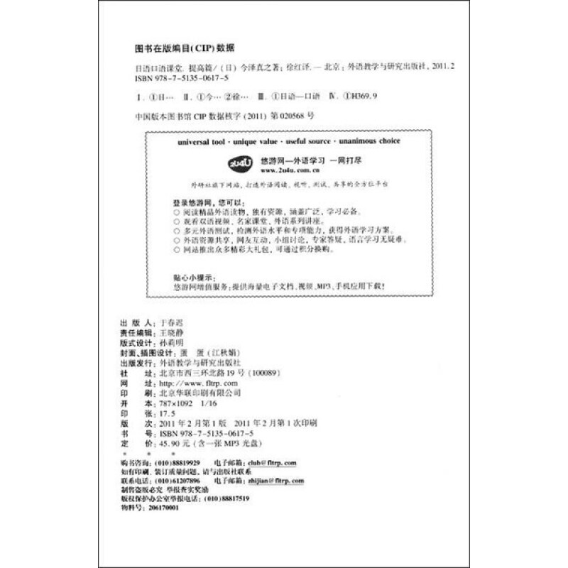 “日语口语课堂”系列教材是由《沪江日语》人气博主、新东方日语教师今泽真之根据多年经验编写的。《日语口语课堂 流利篇1》包括会话、单词、句型讲解、练习、听力、文化小知识等部分,内容轻松活泼又非常实用。更有著名的蛋蛋老师倾心创作的近700幅插图,还有日本NHK教育频道“唱歌的姐姐”——松原美香小姐倾情录音。外研社全力打造的这套“日语口语课堂”系列教材让您开口说日语再不是件难事!