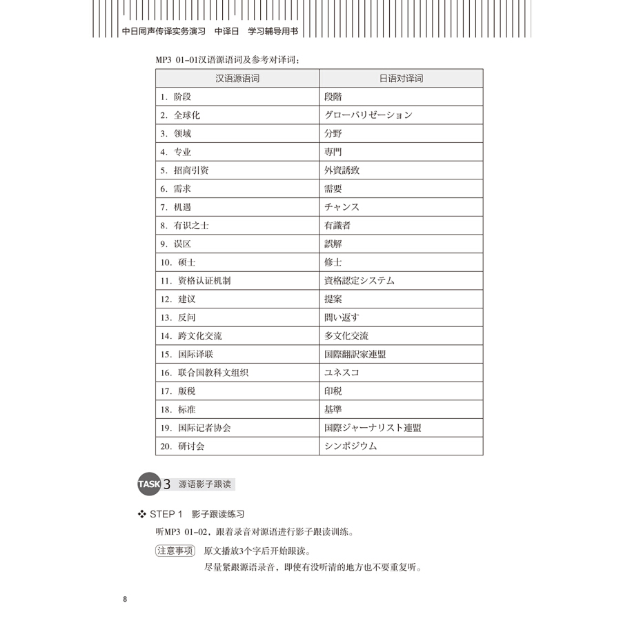 《中日同声传译实务演习中译日学习辅导用书》为“中日同声传译教材系列”的《中日同声传译实务演习中译日》的分册,以素材为主线,内容涵盖文化交流、教育科研、旅游观光、汽车行业、环境保护、体育运动、IT技术、科学技术、大众传媒、医疗卫生、社会问题、经济金融、政治外交、商贸往来等领域。通过快速反应、听解、跟读、复述、概述、转述、视译等技能技巧环节的训练,逐步掌握交传、同传等口译技能技巧。在科学系统地学习《中日同声传译技巧技能训练》一书、夯实口译技能技巧的基础上,通过各个领域不同素材的反复训练,帮助学习者循序渐进了解并把握交替传译、同声传译及相关口译形式的内容、特点及操作过程。与此同时,在训练中进行自我评估,随时查漏补缺,针对具体情况进行训练,确保训练效果。