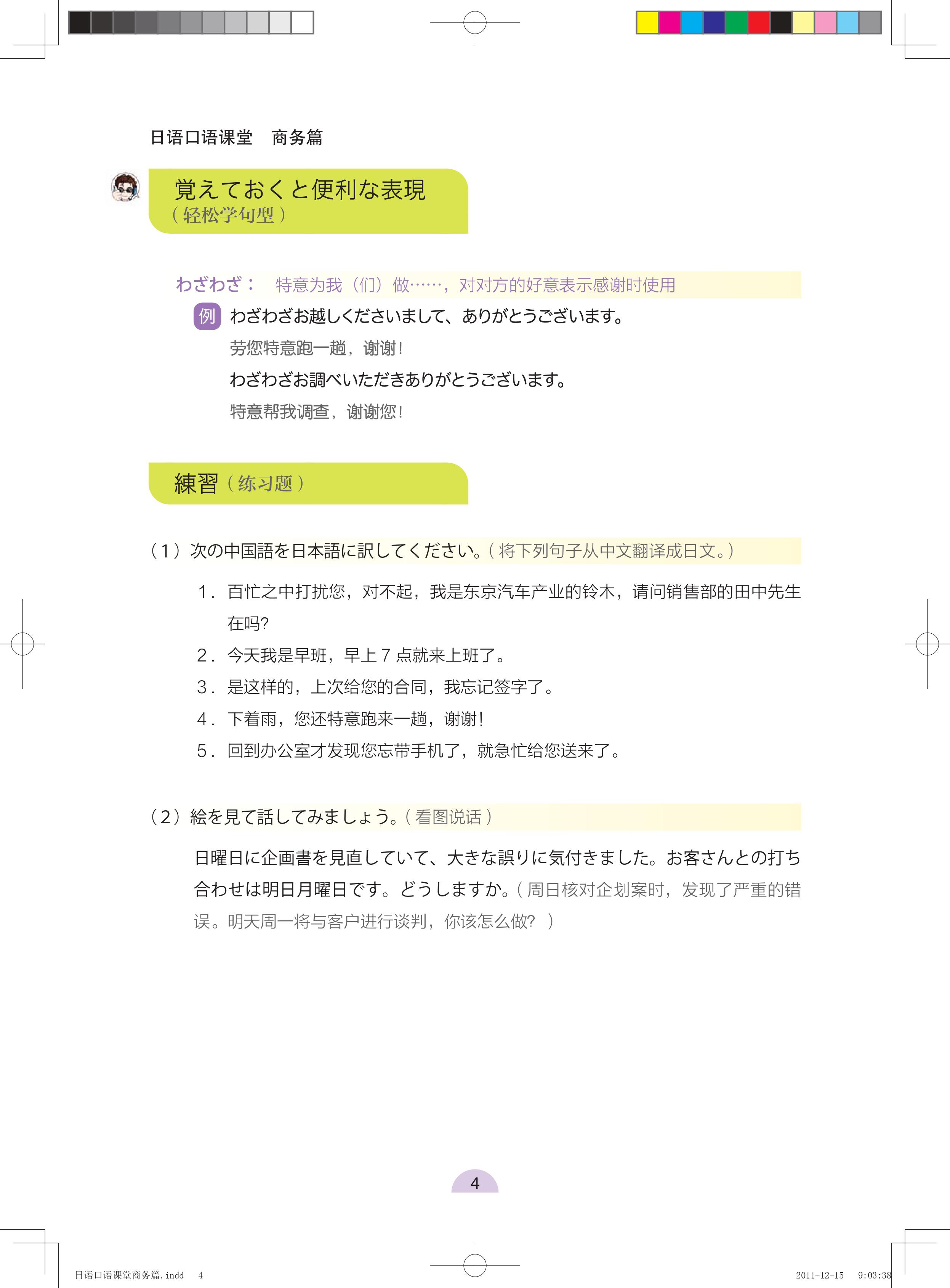 《日语口语课堂:商务篇(全彩图文)》包括会话、单词、句型讲解、练习、听力、文化小知识等部分,内容轻松活泼又非常实用。更有著名的蛋蛋老师倾心创作的近700幅插图,还有日本NHK教育频道“唱歌的姐姐”——松原美香小姐真情献声录音。外研社全力打造的这套“日语口语课堂”系列教材让您开口说日语再不是件难事!