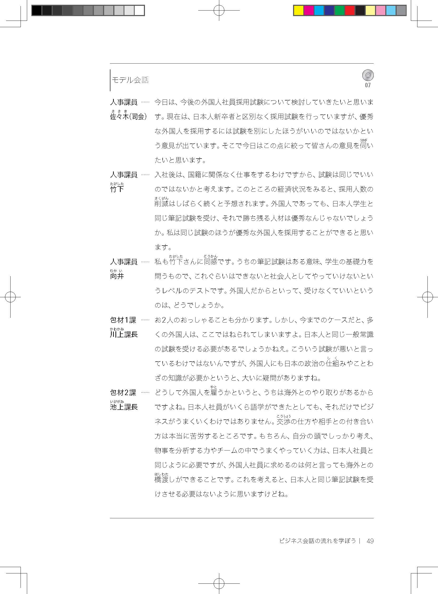 《高级商务实战日语》是一本以完成会话任务为主导,在具体的情景中锻炼商务日语表达能力,培养学习者作为职场人的基本素质的商务日语教材。如今在跨国企业中工作,学习者不仅要有扎实的商务日语会话能力,更重要的是具备跨文化交际能力。本书特色就在于,在「モデル会話」中教授商务日语表达方式,在案例学习中引导学习者跨文化思考。希望学习者通过使用这本《高级商务实战日语》教材,能够在书中设置的商务场景中实际演练职场中需具备的各种技能,同时培养自己的跨文化意识,为顺利步入职场做好铺垫。