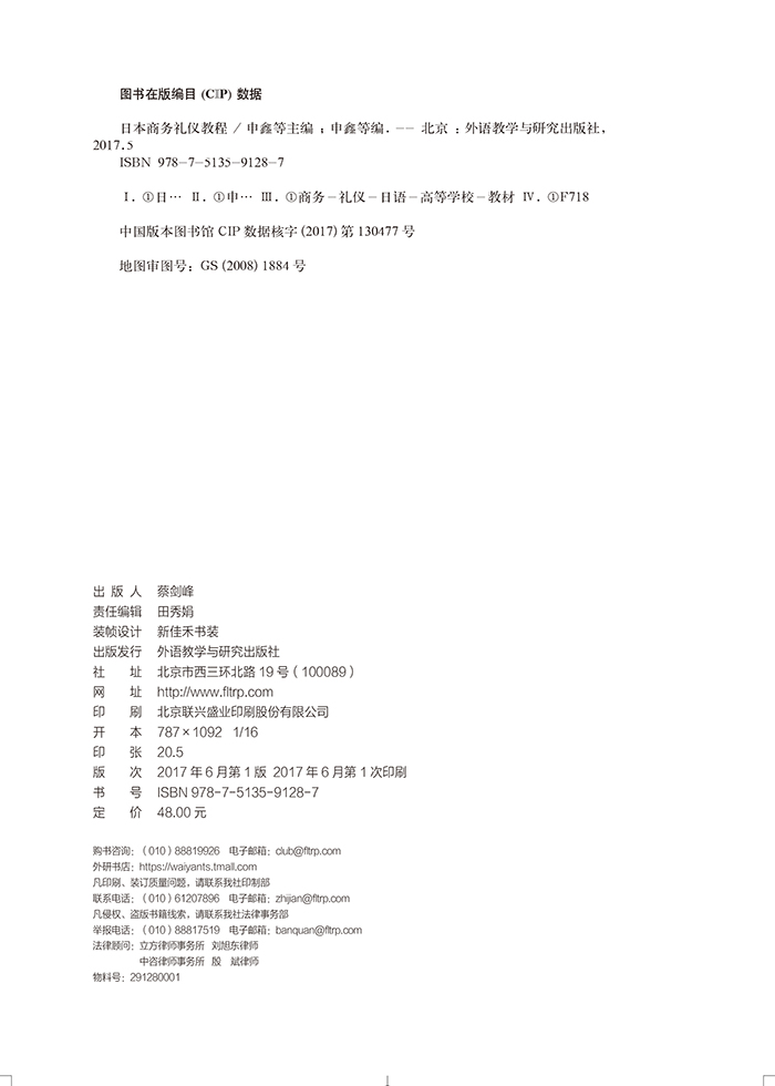 《日本商务礼仪教程》由中日双方作者精心编写而成。内容详实、丰富,实用性强。是日本公益社团法人、全国经理教育协会主办的“社会人常識マナー検定試験”指定教材。全书分为三编。“第1編社会常識” “第2編コミュニケーション” “第3編ビジネスマナー”。每编包括内容丰富、详尽实用的日本商务知识。全书还包括4回单元测试和两回综合练习。并在书的*后附有“卷末资料”。单元测试和综合练习的答案以小册子的形式附在主教材之后。