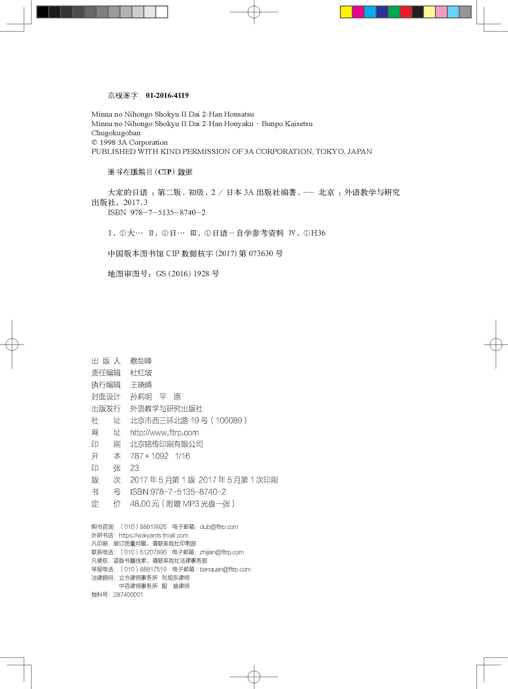 《大家的日语初级2(第二版)》是外语教学与研究出版社从日本3A出版社引进的一套日语学习教材,书中涉及的话题从生活场景入手,从垃圾扔法到学习做菜,从寒假计划到马拉松比赛,可谓内容丰富,贴近日常学习与生活的方方面面,尽可能得将日本现状与日本人的生活方式与社会规律如实反映出来,为学习者提供了全方位的学习材料。课程设置涉及初级日语学习的众多语法项目,不仅配有例句、句型,还结合每一课的内容设置了会话。每课都有单词、语法讲解,还搭配有大量练习,不仅有基本的例句替换练习,还包括听力练习。