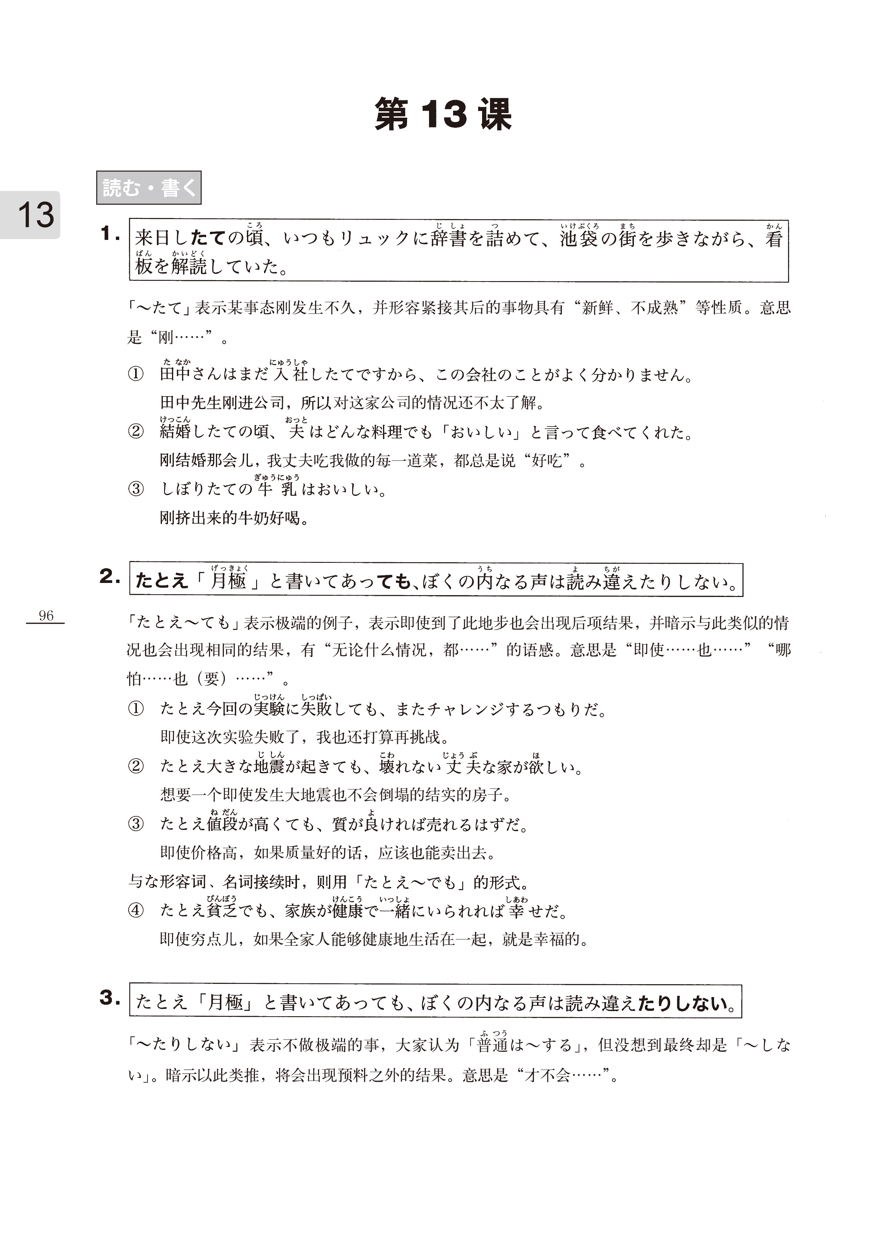 《大家的日语中级2学习辅导用书》是《大家的日语中级2》的配套辅导用书,《大家的日语中级2:MP3版》是继《大家的日语中级1:MP3版》之后策划、编写的一本中级综合日语教材,教学目标是培养学习者在从中级跨入高级时,应具备的相应的听说读写等综合语言能力和自主学习能力。《大家的日语中级2:MP3版》各课的结构与此前出版的各书相比,内容的编排顺序有所不同,主要是考虑到学习者进入中级后期,需要进行立竿见影的拓展练习。因此,本书各课的内容是按读与写、听与说、语法与练习、练习题的顺序排列。