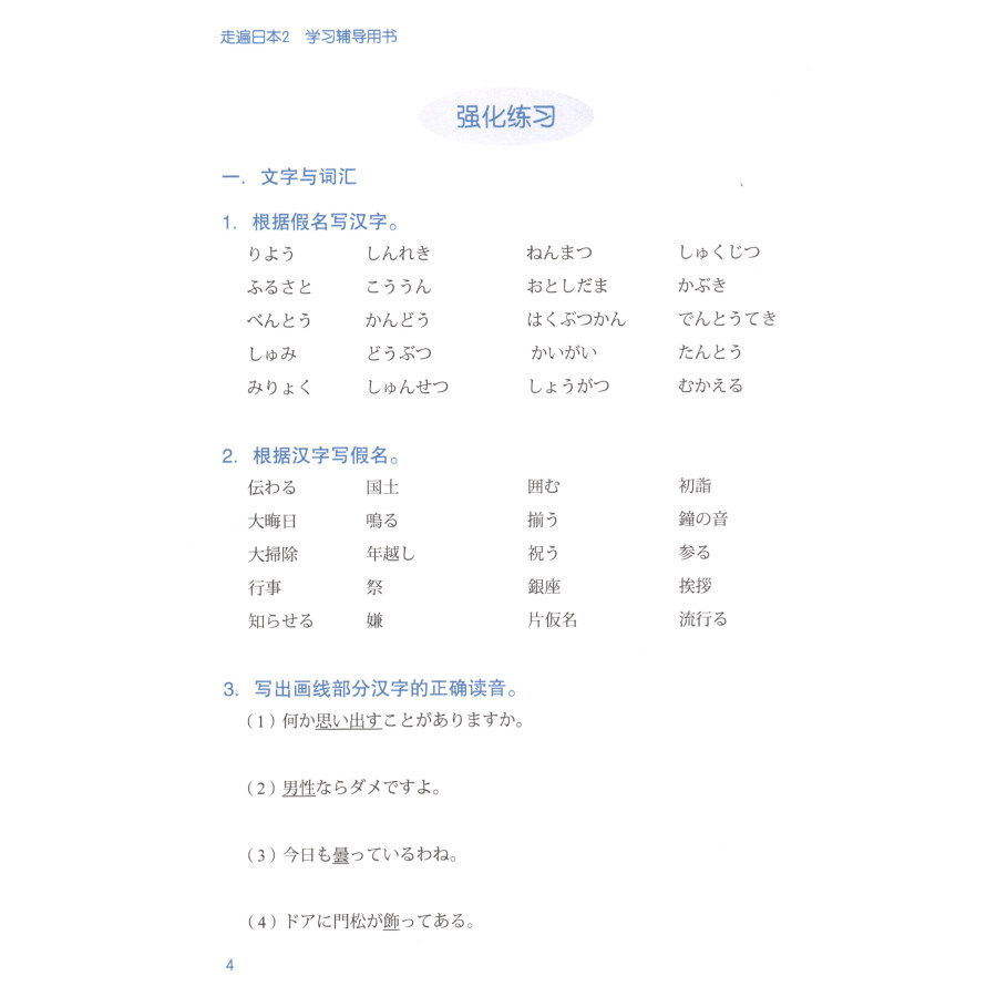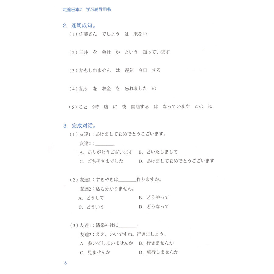 《走遍日本2学习辅导用书》是《走遍日本2》的配套参考用书,内容包括课文翻译、补充练习、练习参考答案及听力题原文。其中,每课课后练习的练习1和练习2为单纯的单词替换练习,故没有参考答案,只给出练习3的参考答案。补充练习中每5课后面有一个单元练习,形式与能力考试相同。通过本书的学习,不但能加深对教材的理解,而且对能力考试的备考也有很好的作用。