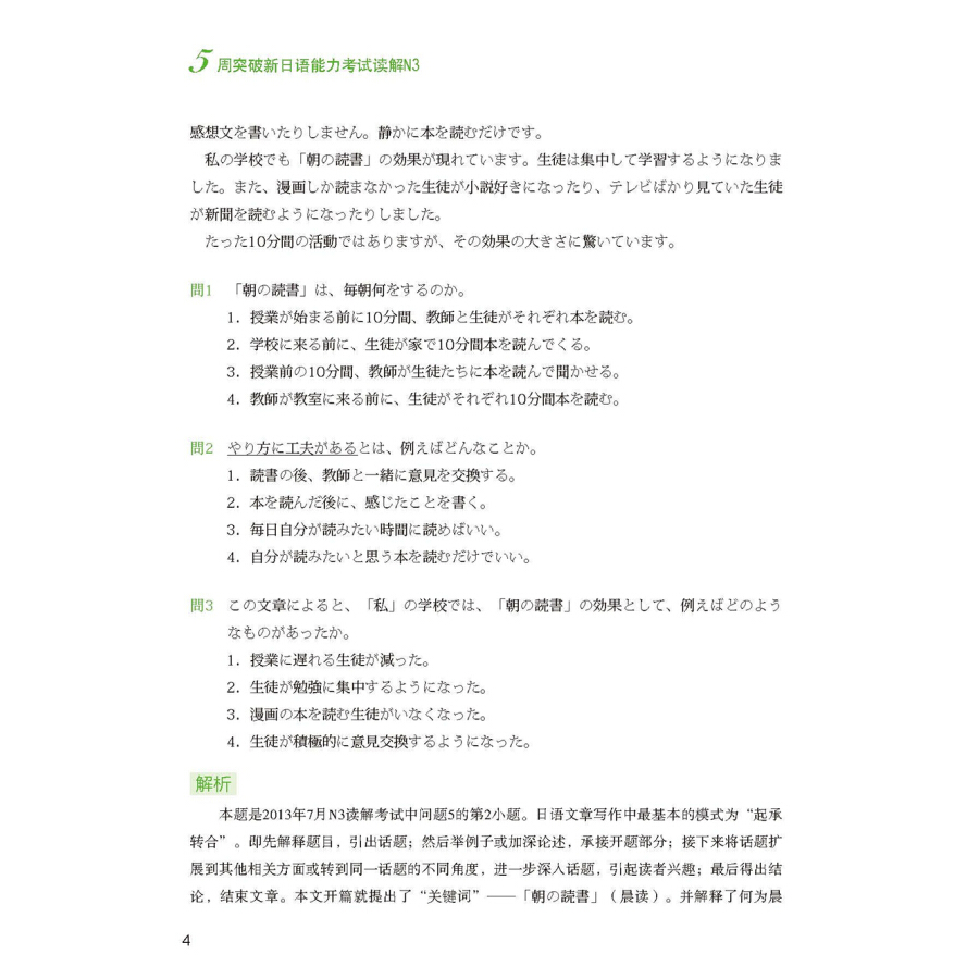 《5周突破新日语能力考试读解N3》是由李晓东主编的新日语能力考试读解N3用书。本书编者以日本国际教育支援协会、日本国际交流基金会编著的《新日语能力考试指导概要版和试题例集(N1、N2、N3)》为依据,在认真研究了近五年读解真题后编成本书。本书把内容设定成5周的学习时间,共包含五个单元。第一单元总结了N3读解题的解题技巧,并辅助历年真题进行了细致的分析;第二至第四单元则分别对N3读解题的四大题型进行了详细讲解,并辅以大量练习。