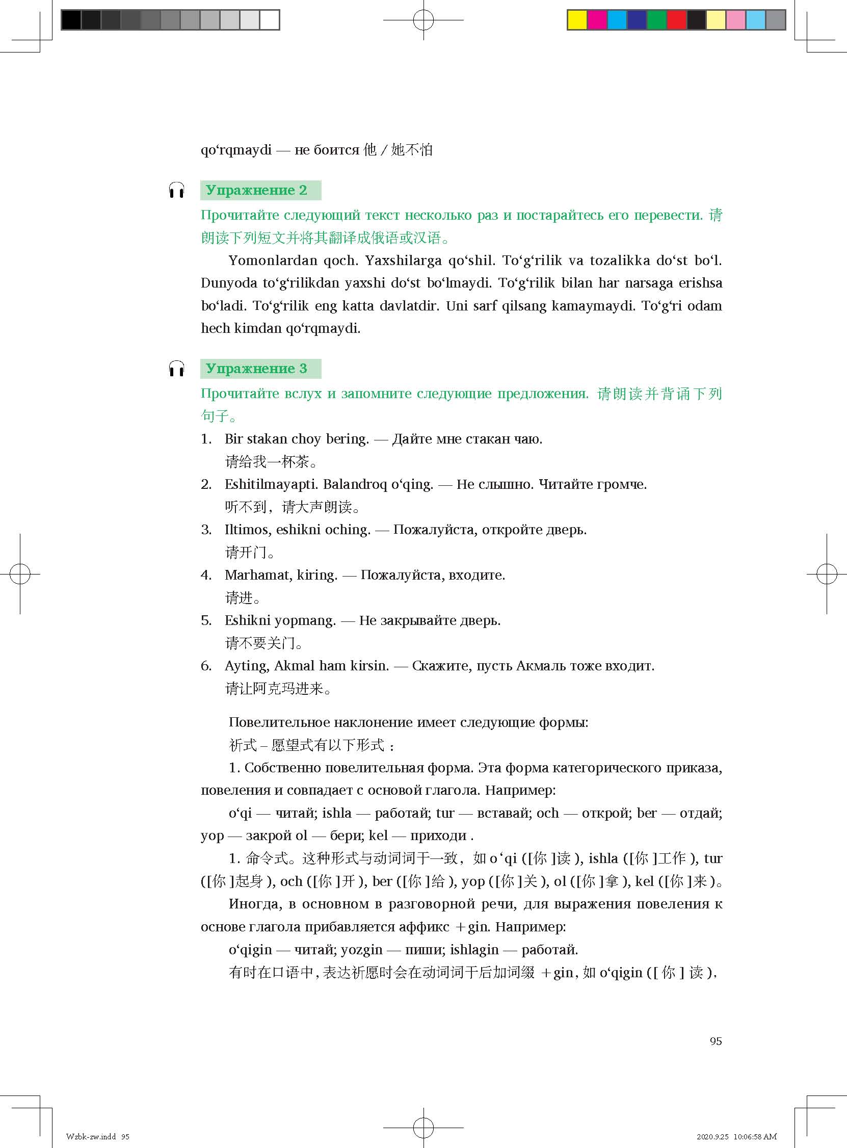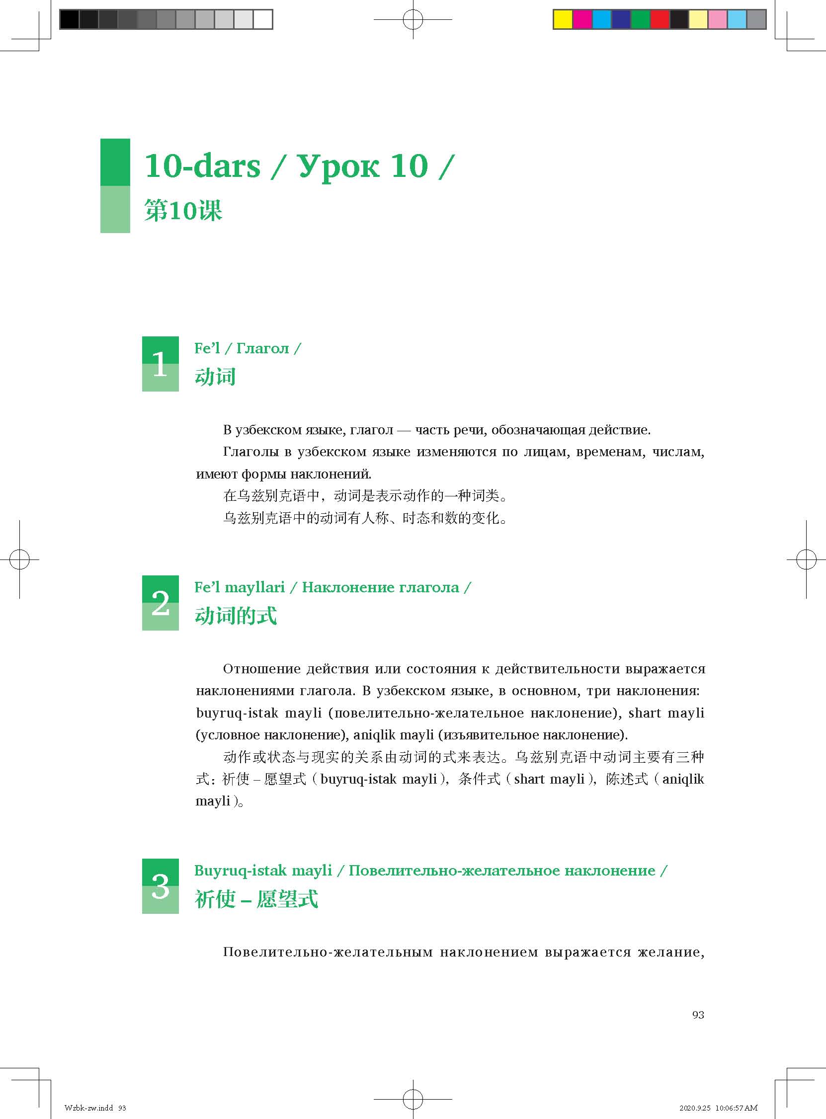 第二章:语法。本章的主要内容为学习乌兹别克语的语法规则。本章内每一课均分为两个部分:第一部分为新单词,句子和课前练习;第二部分为语法规则的讲解;第三部分为巩固练习。