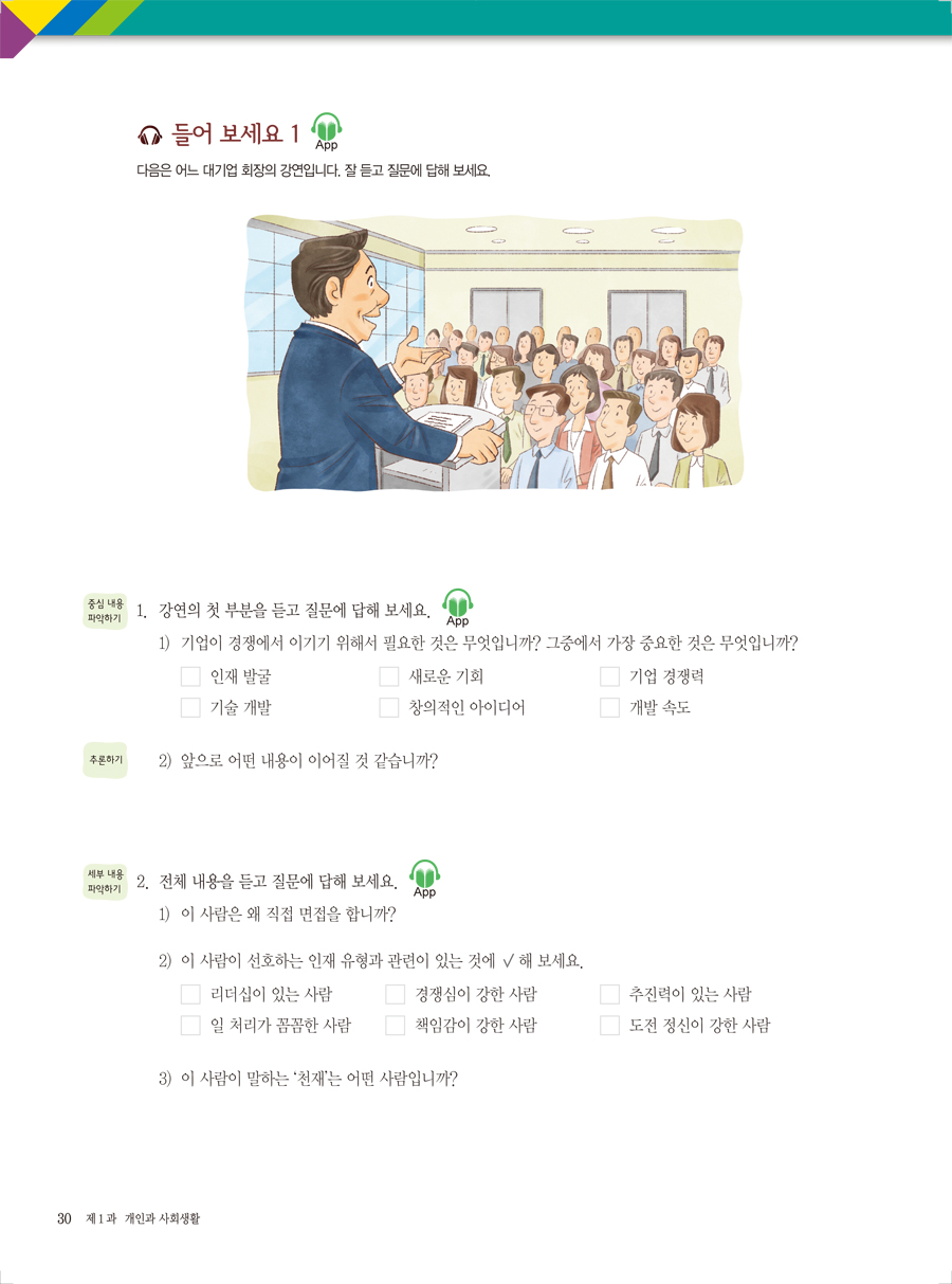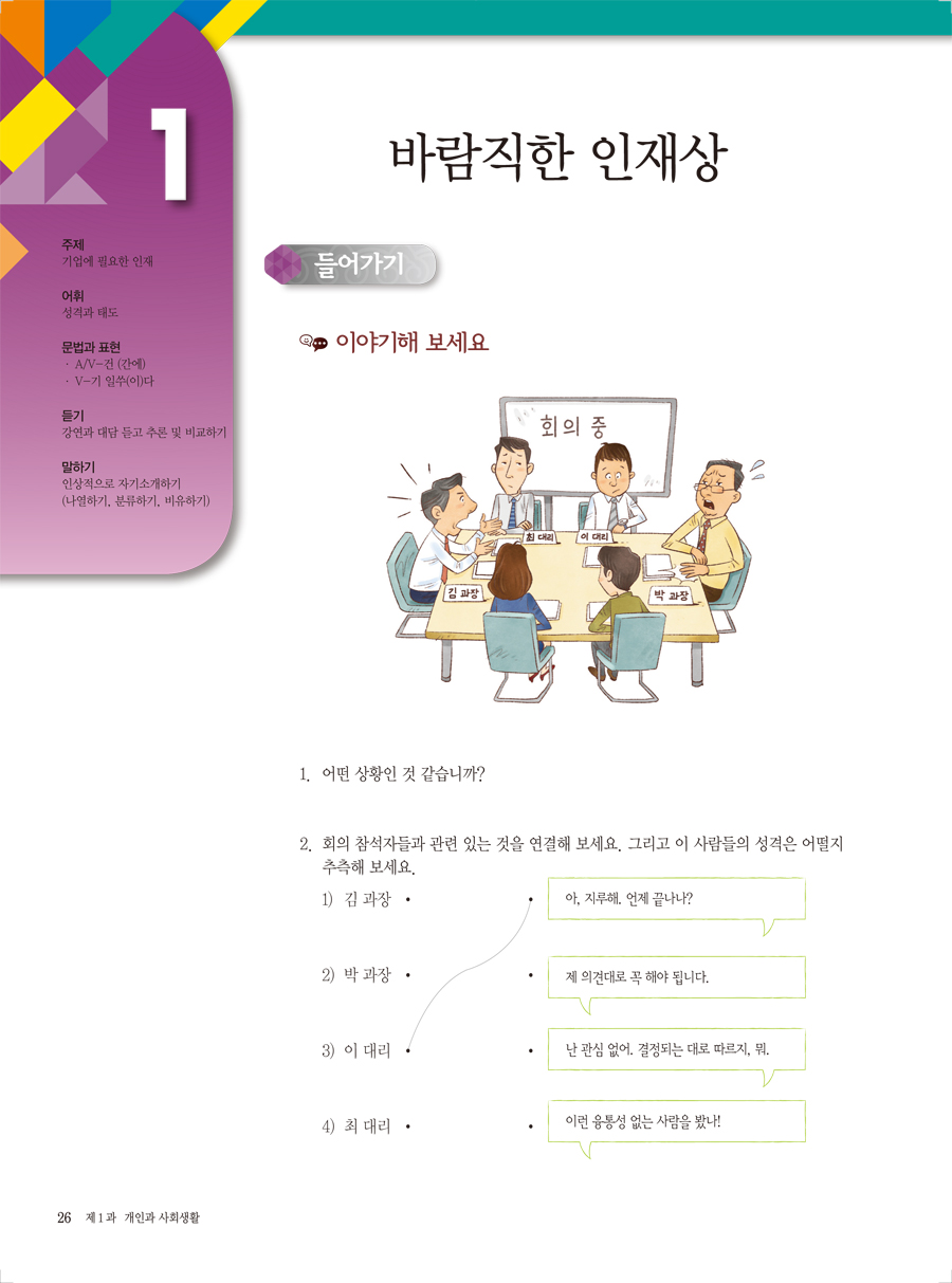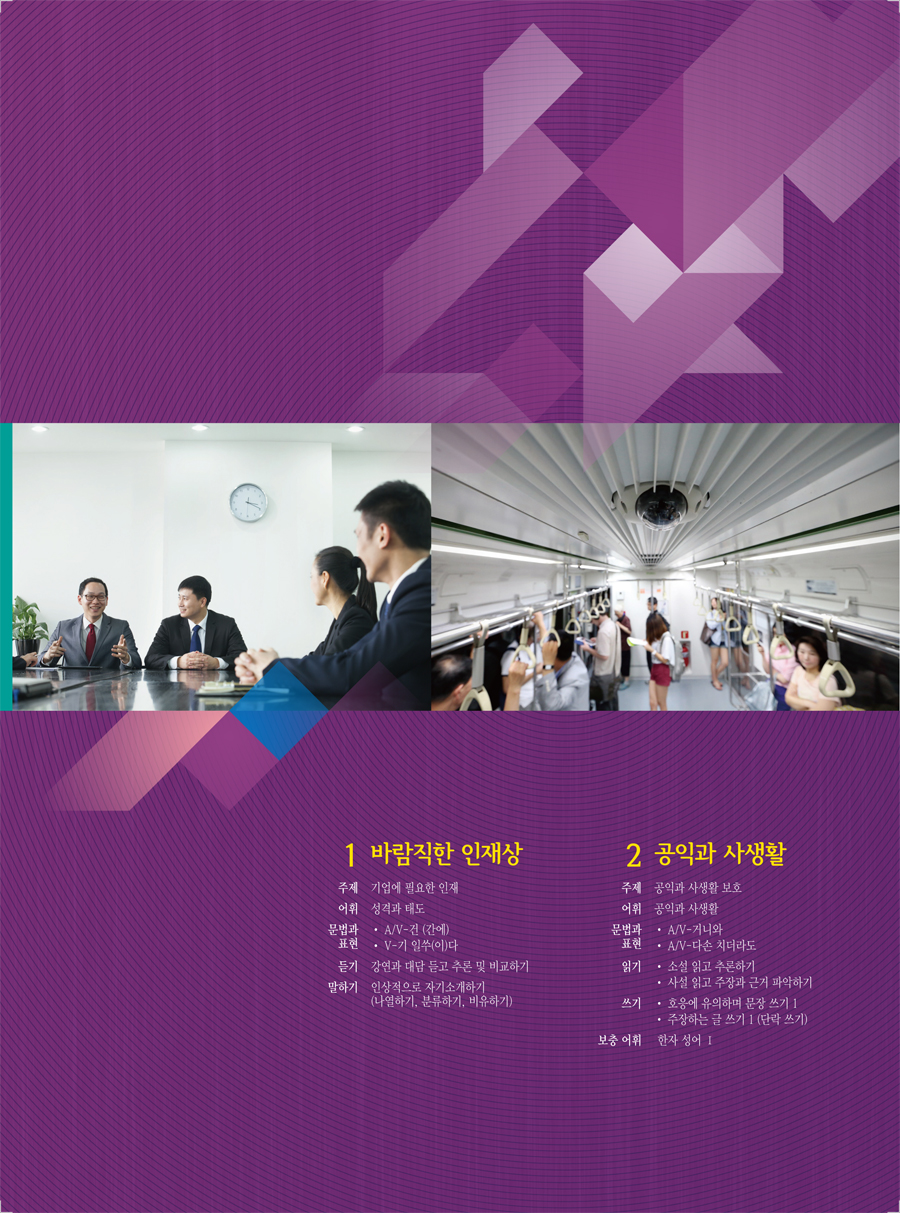 的教学目标是使学习者能够以政治、经济、社会、文化等各种社会性领域为主题用韩国语进行语言交流,并且掌握自己专业领域所必需的语言功能。本书具有如下特点:
