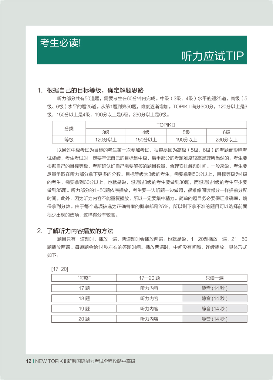 《NEW TOPIK II韩国语能力考试全程攻略中高级》是由新韩国语能力考试研究专家金勋老师以正在备考TOPIK的外国考生为对象的综合学习教材。内容分为准备阶段、题型分析、试题解析和应用阶段四个部分。考生在准备阶段可以针对韩国语能力考试中常出现的词汇和语法进行集中学习。然后在题型分析阶段熟悉题型,之后通过对真题和模拟题的练习来强化对题目的分析并培养解题能力。最后通过模拟题进行最终的检验。题型分析精准到位,应试技巧实操性强。