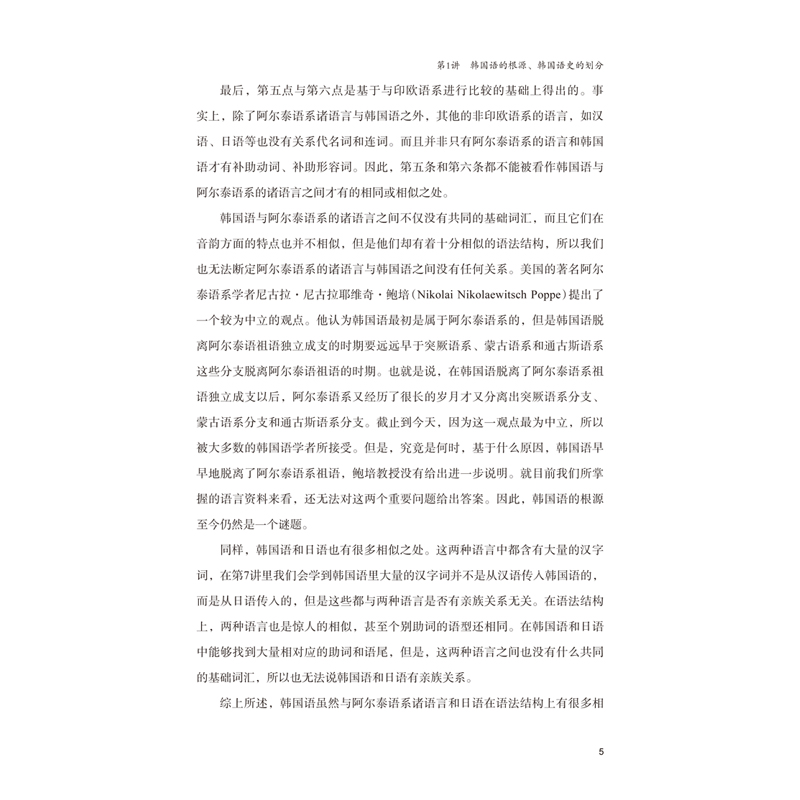 《韩国语史入门》以韩国语专业学生为对象,教材结构设计合理,教材内容由浅入深、由易到难、循序渐进。由于国内韩国语专业学生没有学习韩国语史的基础,所以本教材以后期中世纪韩国语的学习为基础,将教材整体叙述的顺序进行了调整。即先介绍韩字创制之后的后期中世纪韩国语阶段的基本知识,然后介绍近代韩国语至现代韩国语的变化过程,最后再介绍难度最大,需用后期中世纪韩国语知识反溯的韩字创制之前的韩国语各阶段的历史。