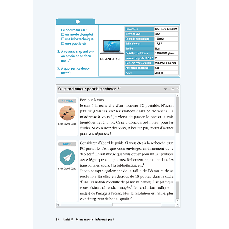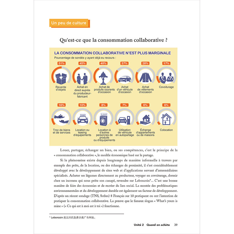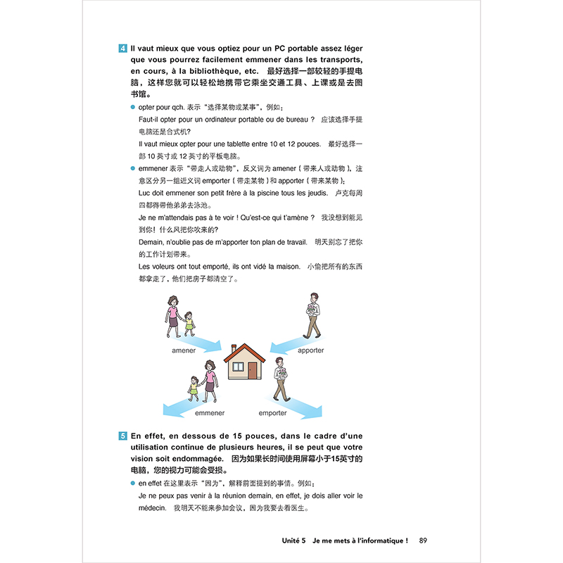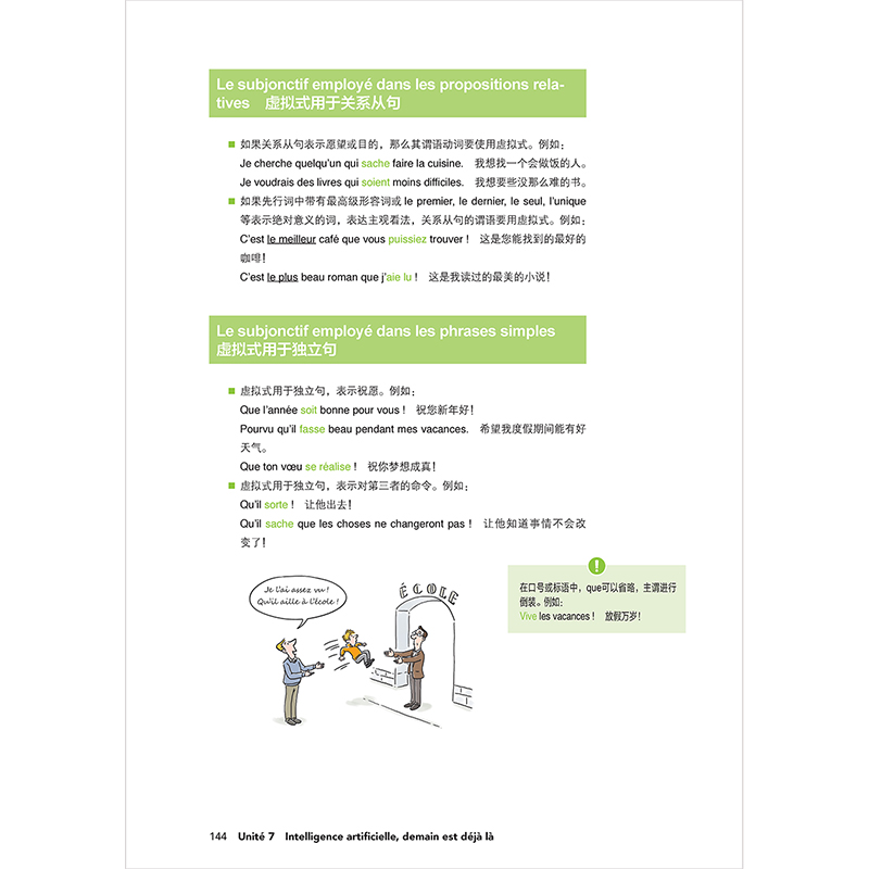 dire plus)、语法(Grammaire)、练习(Exercices)等项目充分挖掘语料的语言知识信息,写作(Production écrite)项目引导学生学以致用,配以主题阅读(Lecture)、文化点滴,以文化交际辅助语言学习。根据板块内容特点,使用“小贴士”、图表、插画、电影海报等,希望为学习者提供理解和学习的便利同时,带来学习的乐趣和美的享受。2个复习单元(Bilan)模拟大学法语四级考试、TCF/TEF等考题类型,进行阶段性复习训练。
