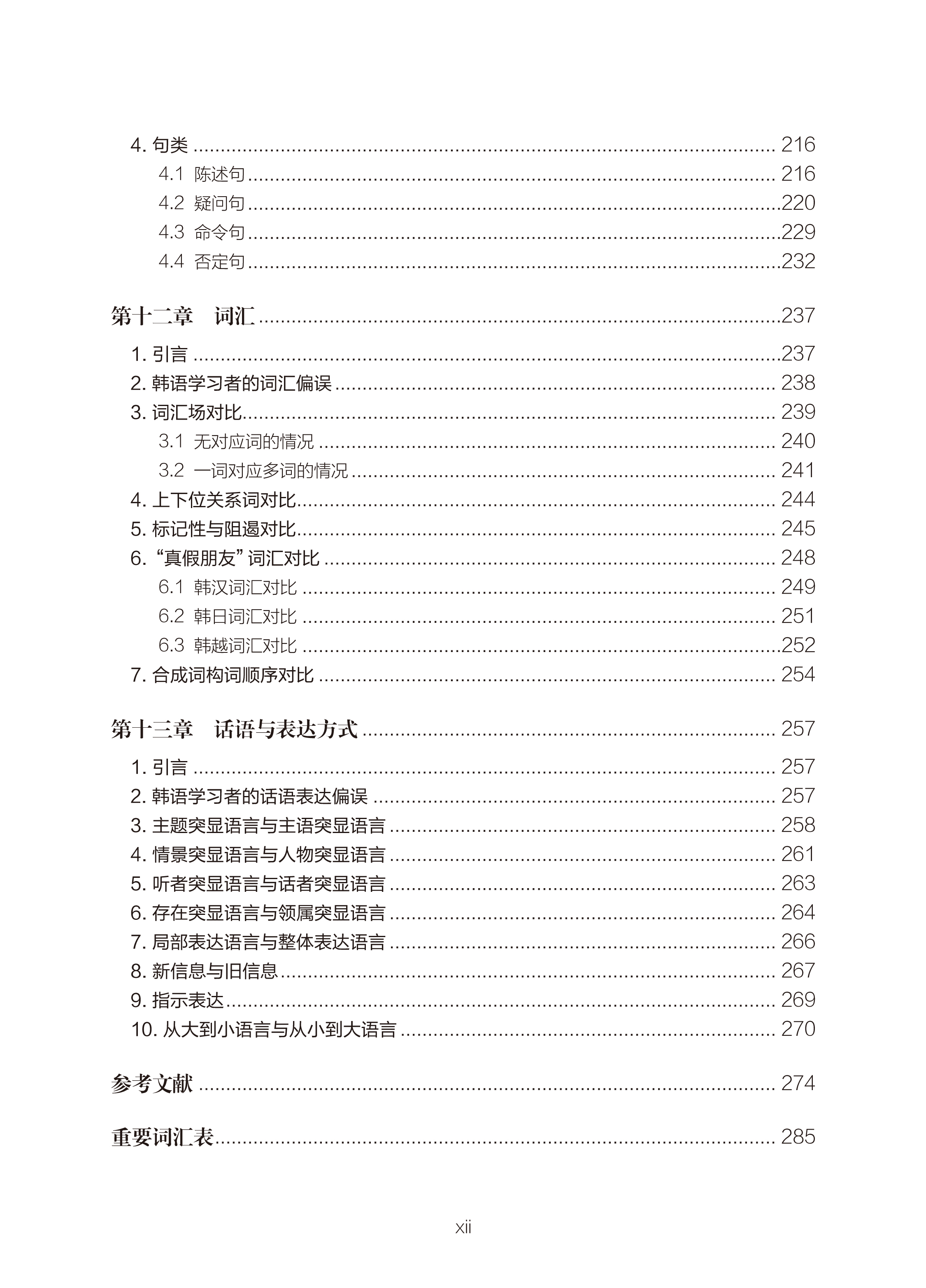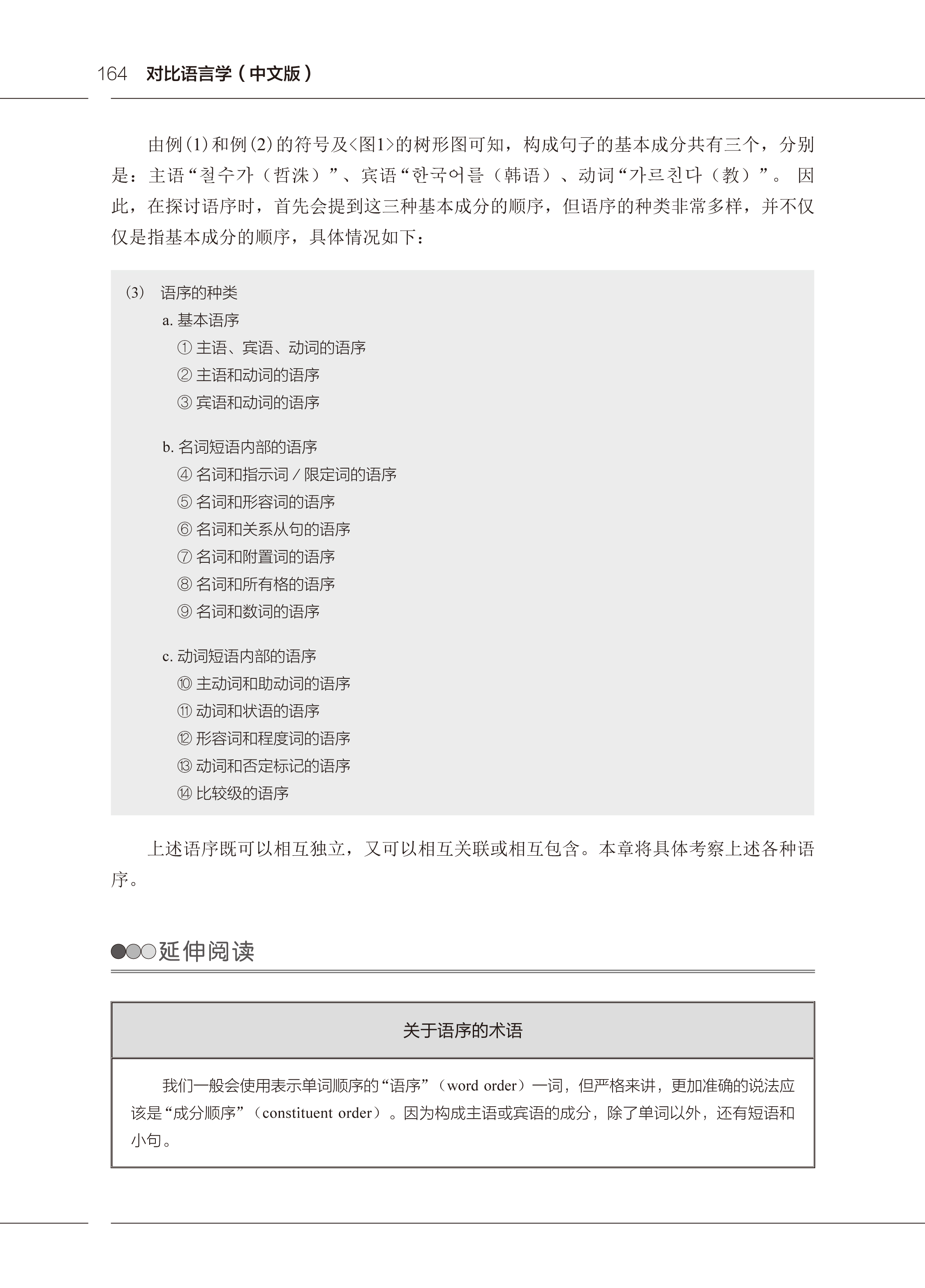 《对比语言学(中文版)》是一本介绍对比语言学的概论书,主要面向广大语言学习者和研究者。本书包括十三章,前两章是理论导入部分,即对比语言学概述和世界语言概览。第三章到第十三章是对比研究部分,包括元音、语序、时与体、句类、辅音、音节、音变现象、词汇范畴、构词法、词汇、话语与表达方式。各章节又分为引言、偏误分析和各语言的特征三部分。先详细介绍了对比语言学的相关理论,阐明自然语言的普遍特征,再通过丰富的示例分析不同地区韩国语学习者常见的偏误类型,进而探讨每种语言的区别特征。内容详实,体系完整。