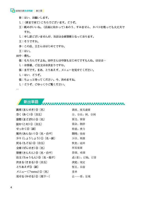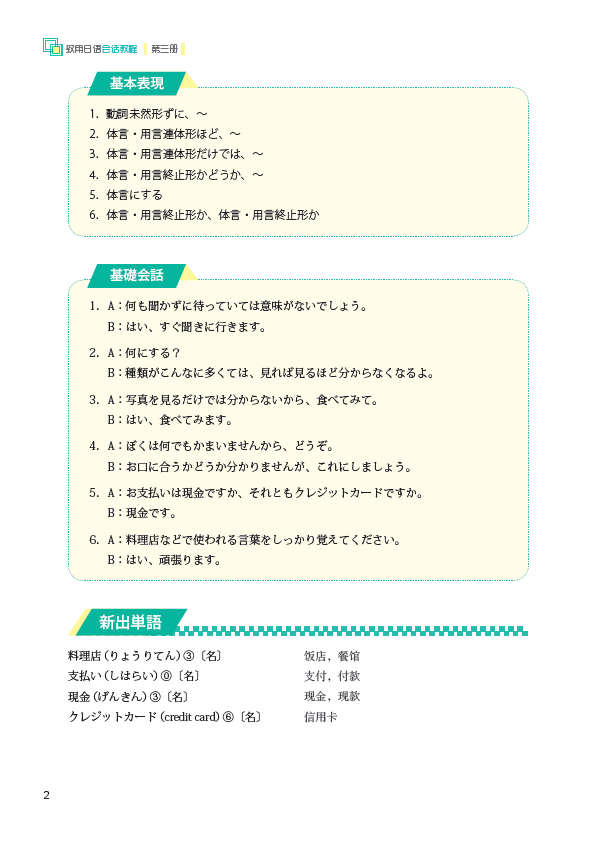 《致用日语会话教程第三册》本着学以致用的宗旨,以日常生活、学校生活和社会生活中的典型场景为依托,系统计了鲜活实用的日语会话内容及配套练习,内容编写特别强调"系统"和"全面",突出能力培养,是为高职高专日语专业零起点学生量身打造的会话教材。