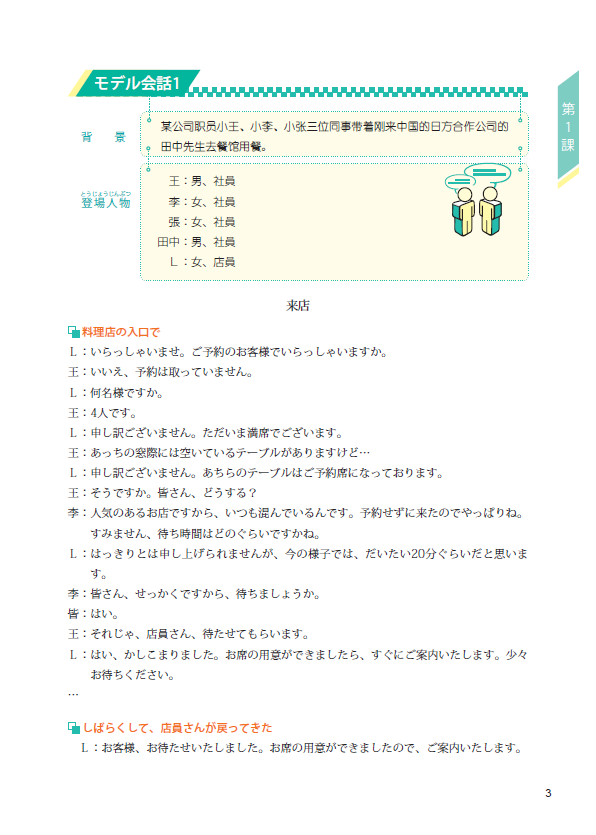 《致用日语会话教程第三册》分为10课,每课一个主题,每一课的所有内容围绕主题,从不同角度的演绎,主题鲜明地立体呈现一个完整的生活、学习、工作的过程。每一课的范文由三部分组成,这三部分基本上呈现一个事件发生、发展、结束的过程,让学习者学会从头至尾描绘一个故事的方法,并具备响应能力。在范文和练习的关系方面,特别强调"互补性",而不是传统观念中的"练习是训练范文所学的内容"。即范文是示范和引领,练习则是范文的强化与扩充。