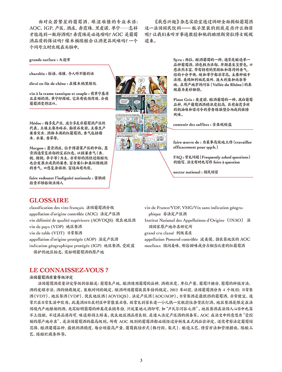 《葡萄酒传世之旅》是"法语‘漫’游系列"中的一部,是引进自法国达高出版社的漫画作品。该系列包含《兔子波尼》、《无基百科》和《葡萄酒传世之旅》三部漫画,主要作为辅助法语学习的读物,适于"欧框"B1及以上级别的法语学习者使用。其中,《葡萄酒传世之旅》是一部将葡萄酒知识百科和幽默元素融为一体的科普漫画。它以实验室研究人员的葡萄园之旅为主要情节,通过旅程中见识到的事物和结识的各类人物介绍葡萄种植、葡萄酒发展史、葡萄酒销售、葡萄酒品鉴等知识。每一页漫画均附单独的注释页,对涉及的词汇、语法知识和专业术语做解释,并补充相关小知识。