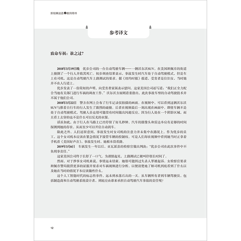《新经典法语4教师用书》是《新经典法语4学生用书》配套的教师辅导手册。全书与学生用书同步,分为4个单元,共12课。每课由自学指南、重点词汇讲解、理解难点、课文参考译文、听写练习和课后练习参考答案几部分组成。与前三册相比,第四册去掉了精确到分钟的教案,教学重点转移到拓展学生理解和表达的深度及广度上。编者秉承以学习者为中心,鼓励自学和归纳学习的理念,在“自学指南”部分列出了一系列引导性问题,潜移默化地告诉学生如何从多角度对语篇进行解析,旨在帮助学生学会抓重点,进一步提升自主学习能力。