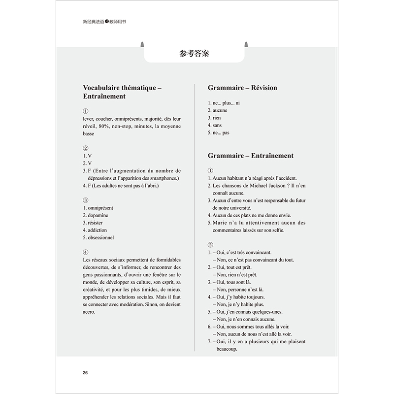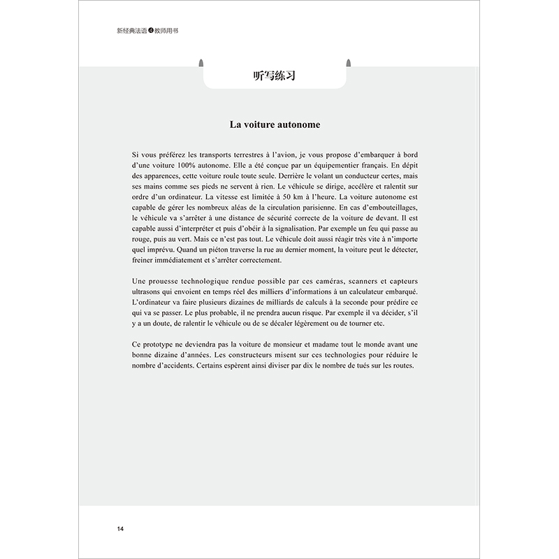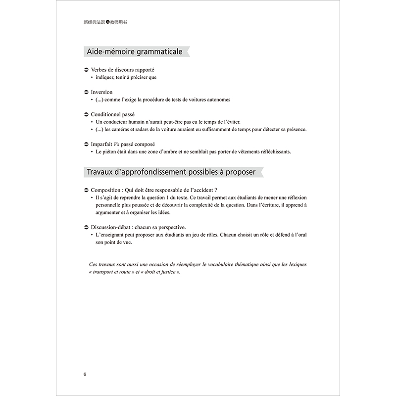《新经典法语4教师用书》是《新经典法语4学生用书》配套的教师辅导手册。全书与学生用书同步,分为4个单元,共12课。每课由自学指南、重点词汇讲解、理解难点、课文参考译文、听写练习和课后练习参考答案几部分组成。与前三册相比,第四册去掉了精确到分钟的教案,教学重点转移到拓展学生理解和表达的深度及广度上。编者秉承以学习者为中心,鼓励自学和归纳学习的理念,在“自学指南”部分列出了一系列引导性问题,潜移默化地告诉学生如何从多角度对语篇进行解析,旨在帮助学生学会抓重点,进一步提升自主学习能力。