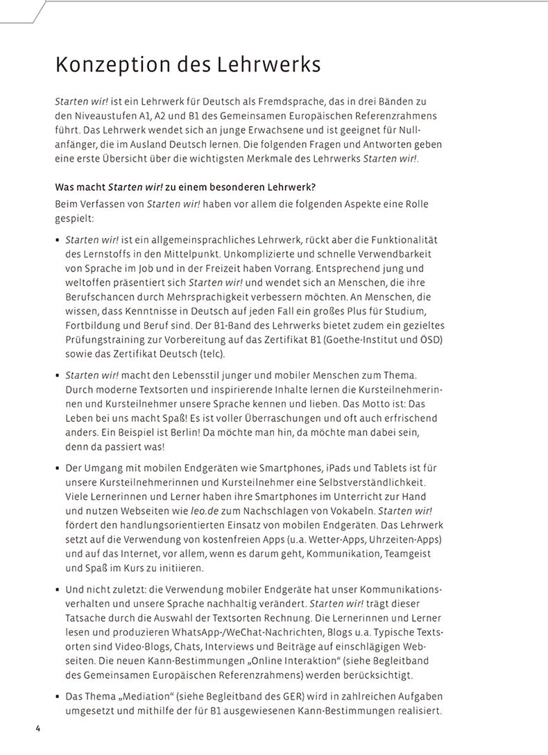 《大家的德语B1教师手册》为《大家的德语B1学生用书(配词汇手册)》的配套用书。《大家的德语》(Starten Wir)是HUEBER出版社2017年起陆续推出的一套德语教材,由外研社原版引进,适用对象为德语初级水平的培训机构学生及自学者。《大家的德语B1教师手册》阐述了教材设计理念,为教师提供了每一主题单元的教学法提示以及课堂活动材料,还包含12套单元测试题并附有答案,供教师作为课堂测验使用,学生亦可用来自测。此外,本书还提供B1学生用书和练习手册的听力原文及练习题答案。