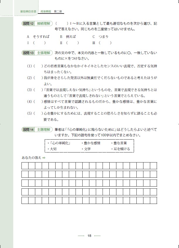 《新经典日本语阅读教程第二册》属于《新经典日本语》系列教材,本教材的编写理念概括为两点:一为学习者自我管理学习;二为通过同伙伴讨论来确认自己的解答,并通过合作来深入阅读。