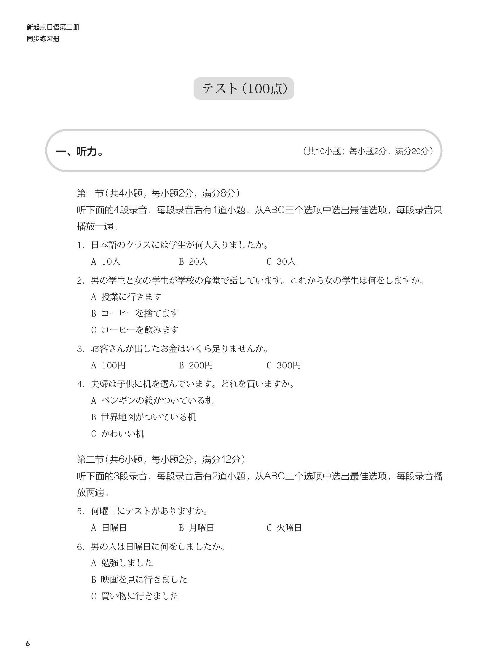 《新起点日语第三册同步练习册》依据《普通高中日语课程标准(2017年版2020年修订)》提出的育人目标和具体要求编写而成,与《新起点日语第三册》教材配套使用。练习册与教材互为补充、相辅相成,为教学提供听、说、读、写、译等方面的训练材料,培养学生日语综合运用能力,使学生在语言能力、文化意识、思维品质、学习能力等方面得到均衡发展。本书按照课次编排,共有8课的基础训练和同步测试,另外还有两套单元测试卷。