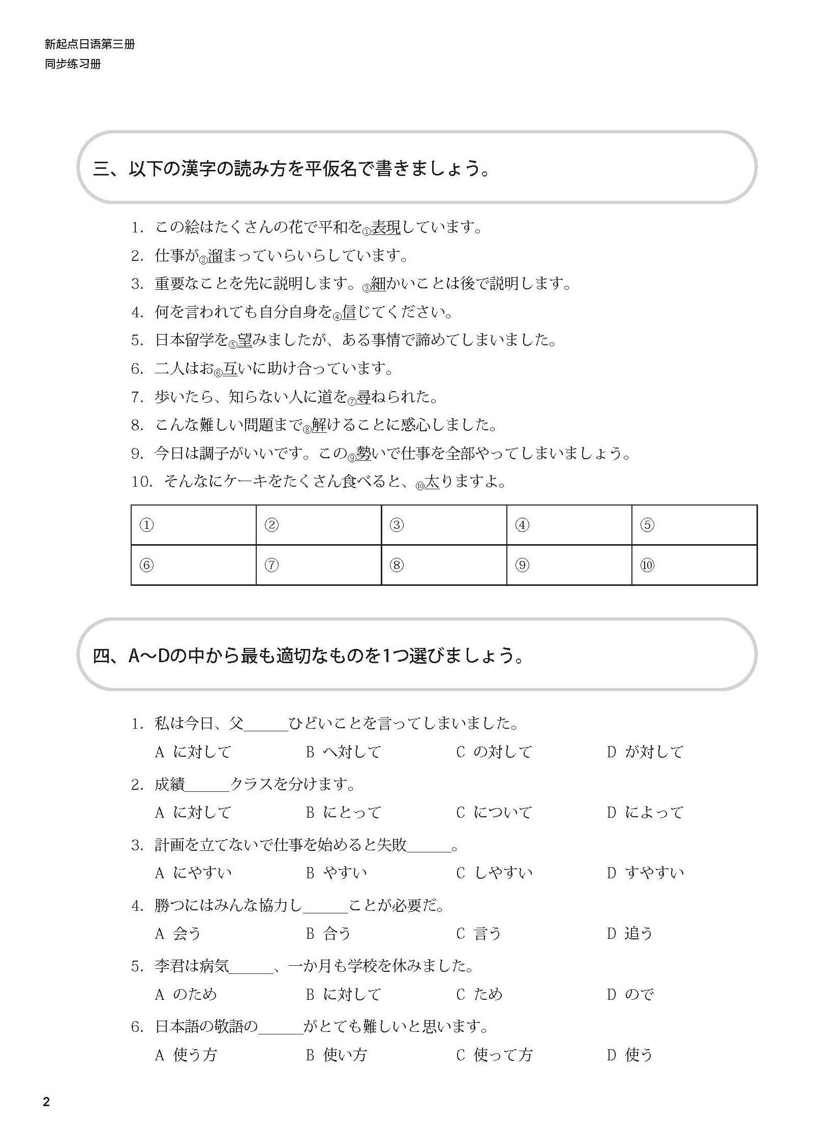 《新起点日语第三册同步练习册》依据《普通高中日语课程标准(2017年版2020年修订)》提出的育人目标和具体要求编写而成,与《新起点日语第三册》教材配套使用。练习册与教材互为补充、相辅相成,为教学提供听、说、读、写、译等方面的训练材料,培养学生日语综合运用能力,使学生在语言能力、文化意识、思维品质、学习能力等方面得到均衡发展。本书按照课次编排,共有8课的基础训练和同步测试,另外还有两套单元测试卷。